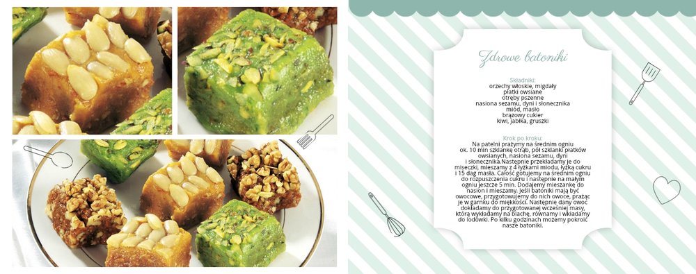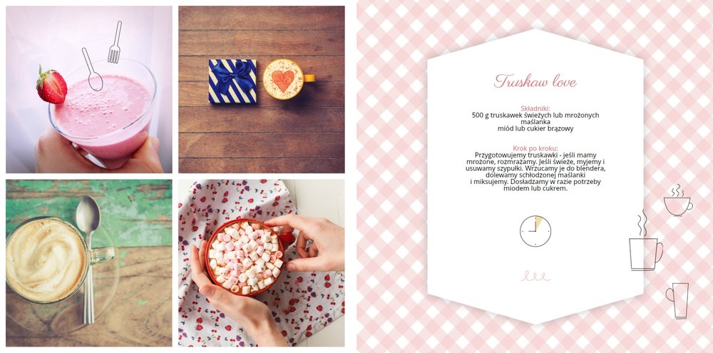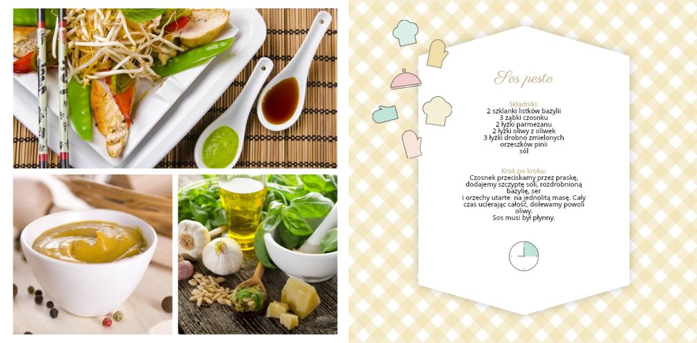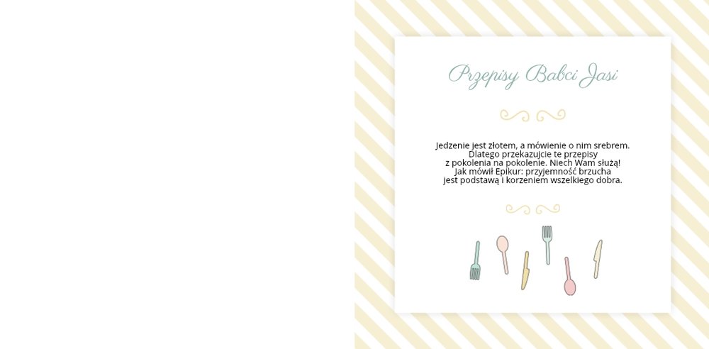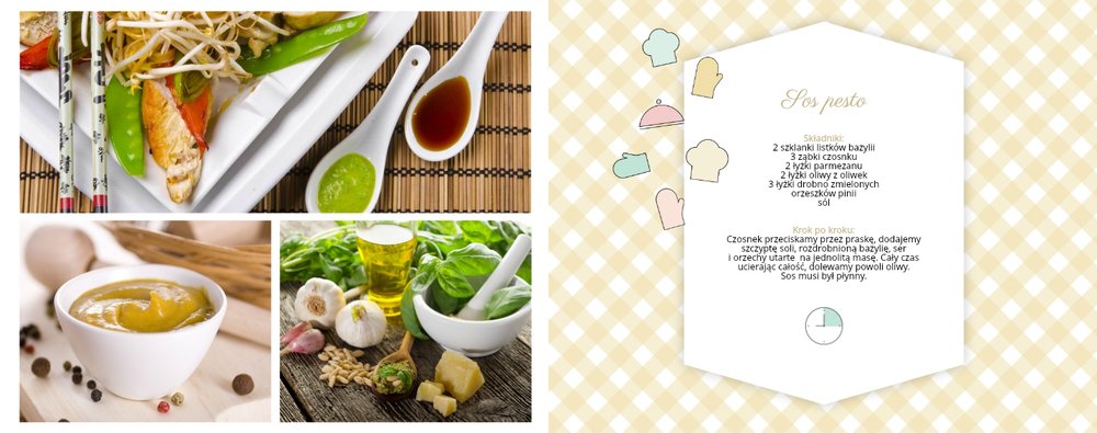 Książka kucharska to propozycja dla miłośników gotowania. Po lewej stronie przygotowaliśmy miejsce na zdjęcia potraw, a po prawej na przepisy, które będą świetnie się prezentować obok kulinarnych dodatków, na tłach stylizowanych na kolorowe obrusy. Dodając zdjęcia ulubionych potraw i przepisy, można stworzyć własną książką kucharską, która będzie świetną pamiątką rodzinną i wyjątkowym prezentem dla osoby, która lubi gotować. Bon appetit!