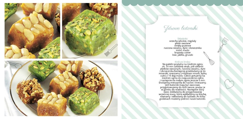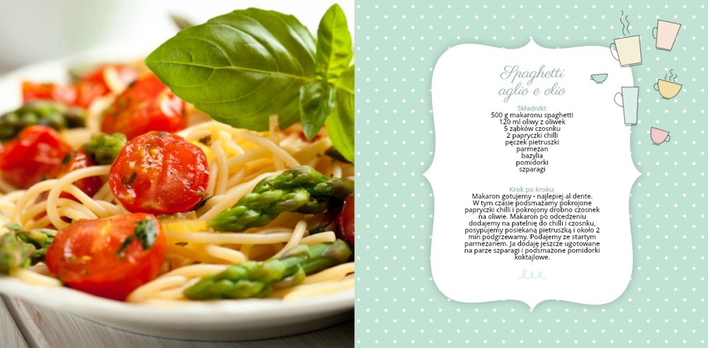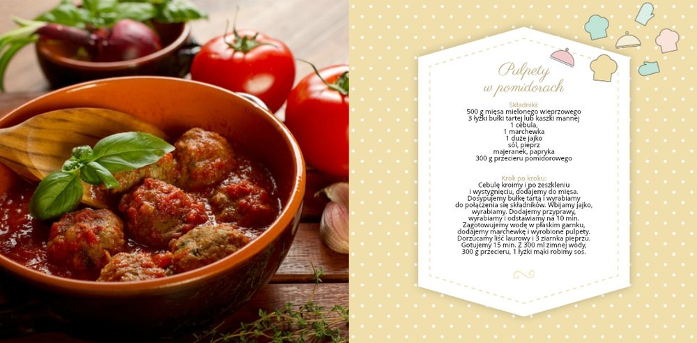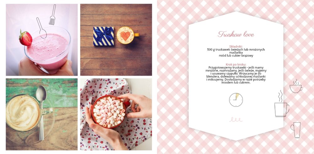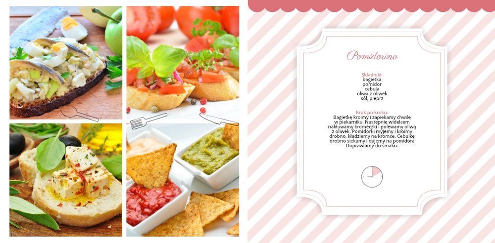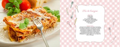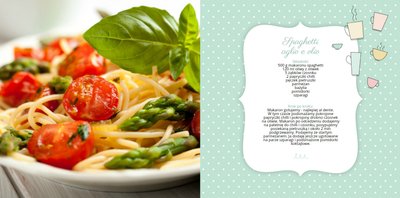 Książka kucharska to propozycja dla miłośników gotowania. Po lewej stronie przygotowaliśmy miejsce na zdjęcia potraw, a po prawej na przepisy, które będą świetnie się prezentować obok kulinarnych dodatków, na tłach stylizowanych na kolorowe obrusy. Dodając zdjęcia ulubionych potraw i przepisy, można stworzyć własną książką kucharską, która będzie świetną pamiątką rodzinną i wyjątkowym prezentem dla osoby, która lubi gotować. Bon appetit!