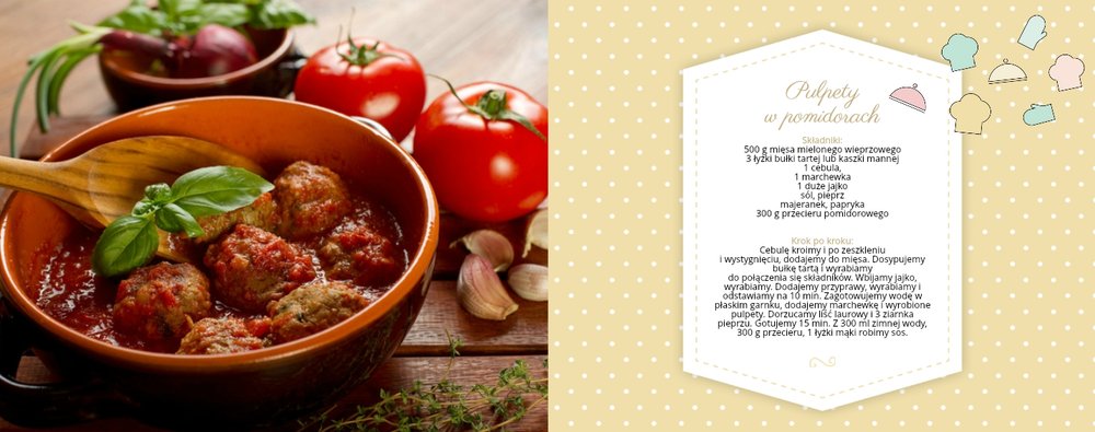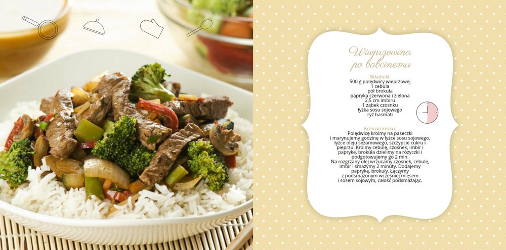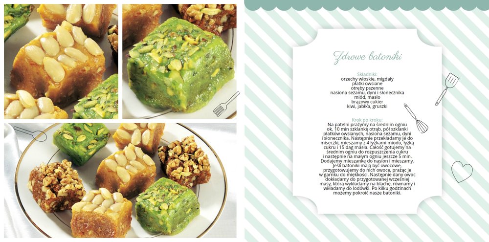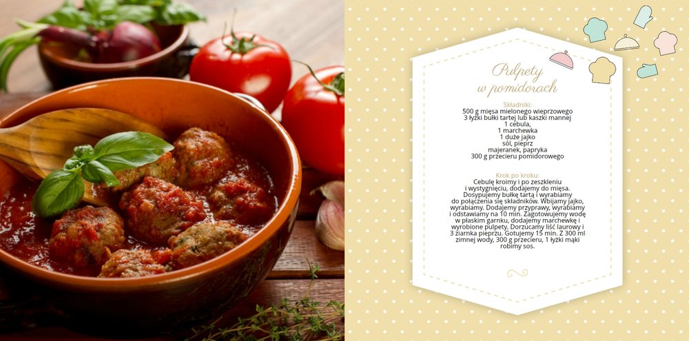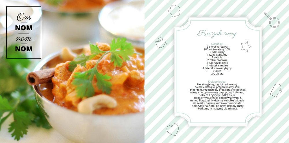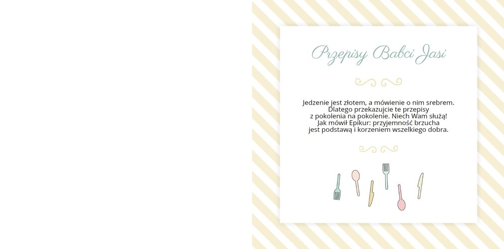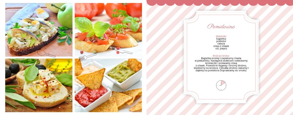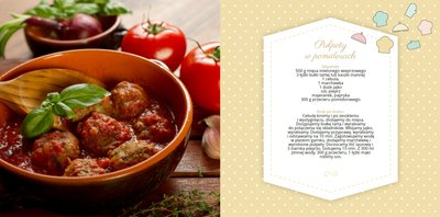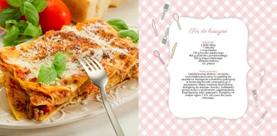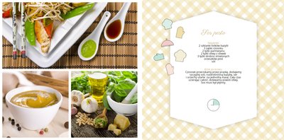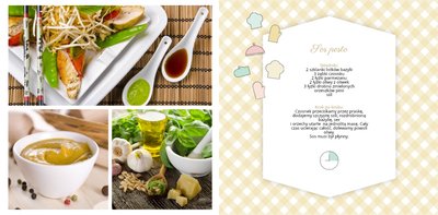 Książka kucharska to propozycja dla miłośników gotowania. Po lewej stronie przygotowaliśmy miejsce na zdjęcia potraw, a po prawej na przepisy, które będą świetnie się prezentować obok kulinarnych dodatków, na tłach stylizowanych na kolorowe obrusy. Dodając zdjęcia ulubionych potraw i przepisy, można stworzyć własną książką kucharską, która będzie świetną pamiątką rodzinną i wyjątkowym prezentem dla osoby, która lubi gotować. Bon appetit!