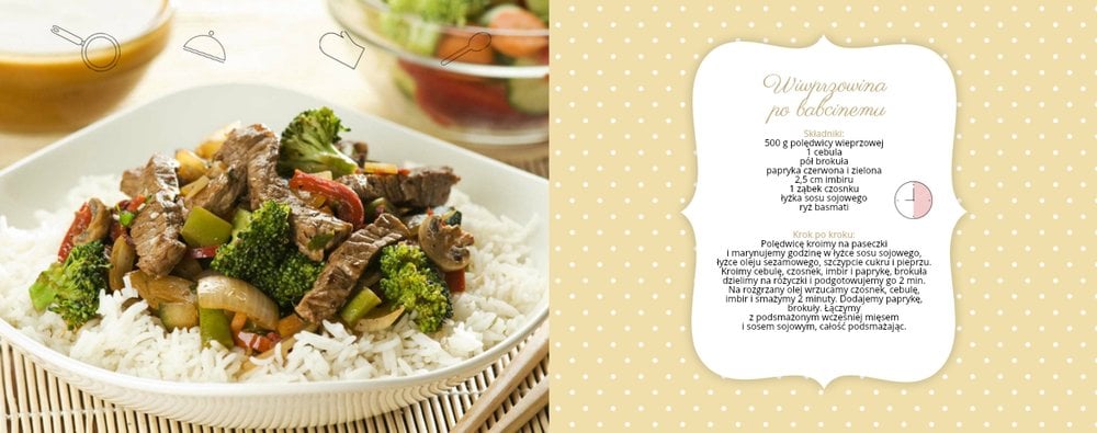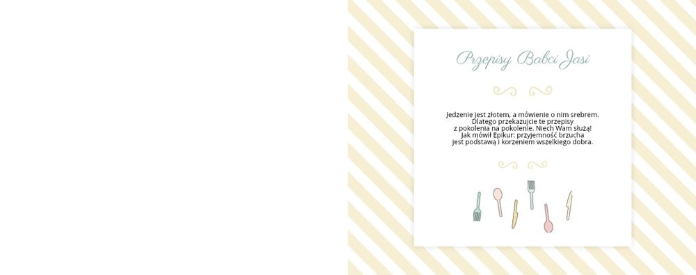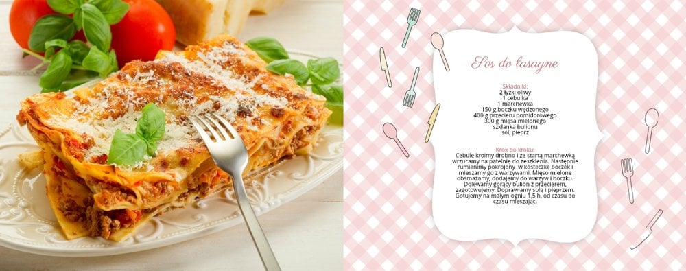 Książka kucharska to propozycja dla miłośników gotowania. Po lewej stronie przygotowaliśmy miejsce na zdjęcia potraw, a po prawej na przepisy, które będą świetnie się prezentować obok kulinarnych dodatków, na tłach stylizowanych na kolorowe obrusy. Dodając zdjęcia ulubionych potraw i przepisy, można stworzyć własną książką kucharską, która będzie świetną pamiątką rodzinną i wyjątkowym prezentem dla osoby, która lubi gotować. Bon appetit!