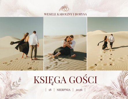 "Księga Gości z ankietami (standard)" została zaprojektowana w duchu stylu boho - naturalnych, lekkich elementów ozdobnych i delikatnych, teksturowanych teł. Całość została zachowana w kremowej kolorystyce, przełamanej brudnym różem i odcieniami bordo. Nie brakuje również metalicznych tonów w postaci złoconych dodatków.