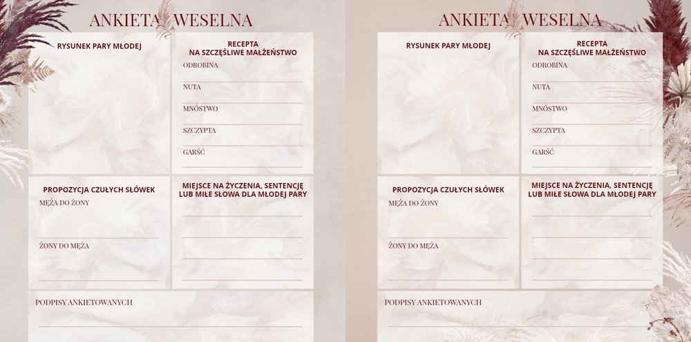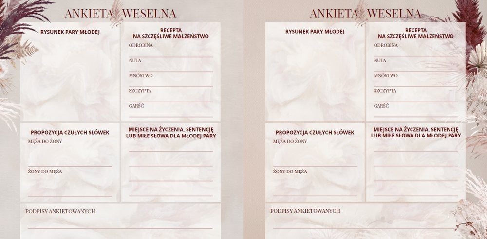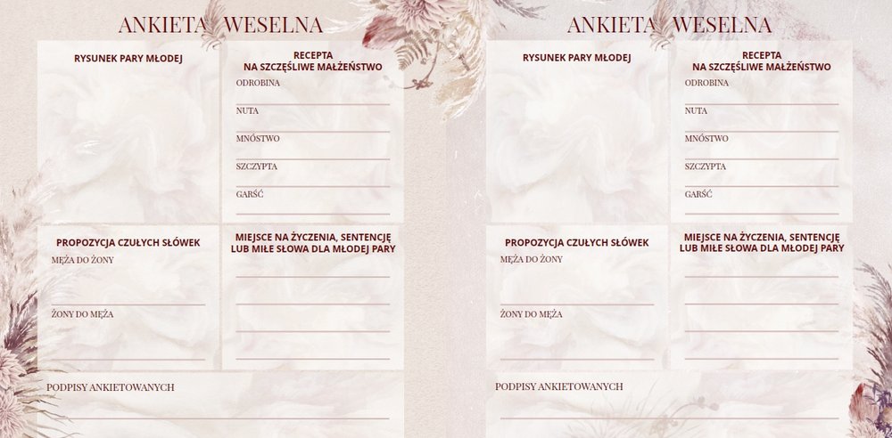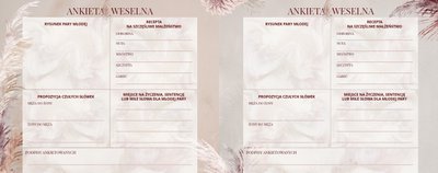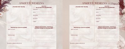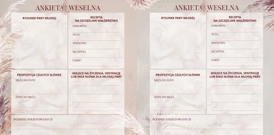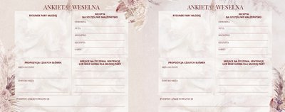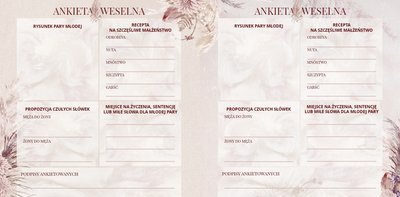 - 50 weselnych ankiet, zawierających krótkie pytania z miejscem na odpowiedzi oraz pole na rysunek Pary Młodej;