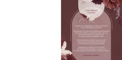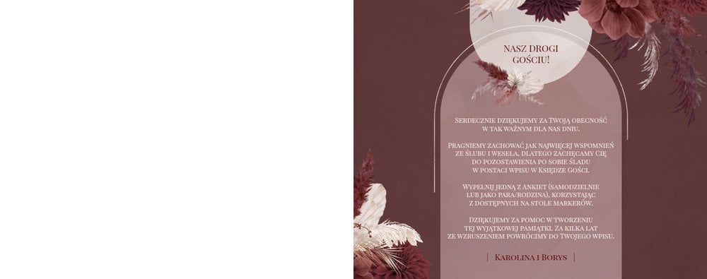 "Księga Gości z ankietami (standard)" została zaprojektowana w duchu stylu boho - naturalnych, lekkich elementów ozdobnych i delikatnych, teksturowanych teł. Całość została zachowana w kremowej kolorystyce, przełamanej brudnym różem i odcieniami bordo. Nie brakuje również metalicznych tonów w postaci złoconych dodatków.