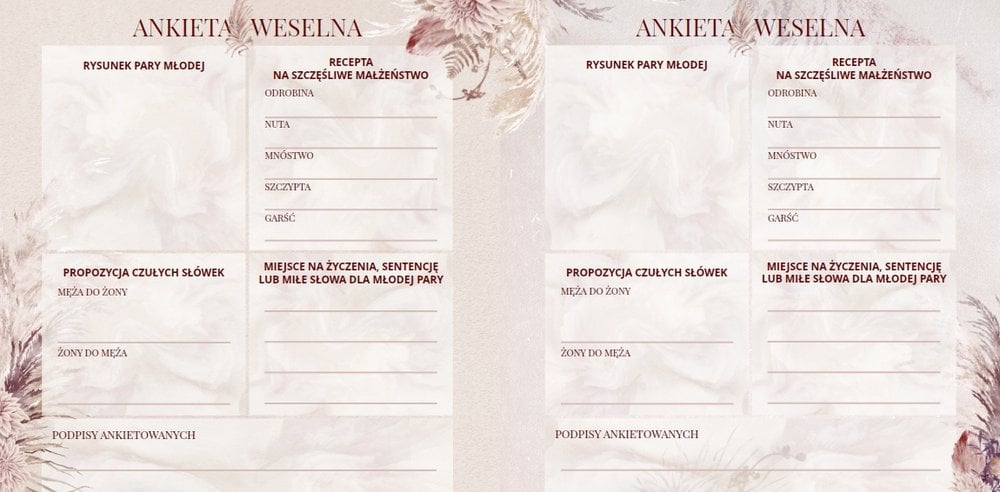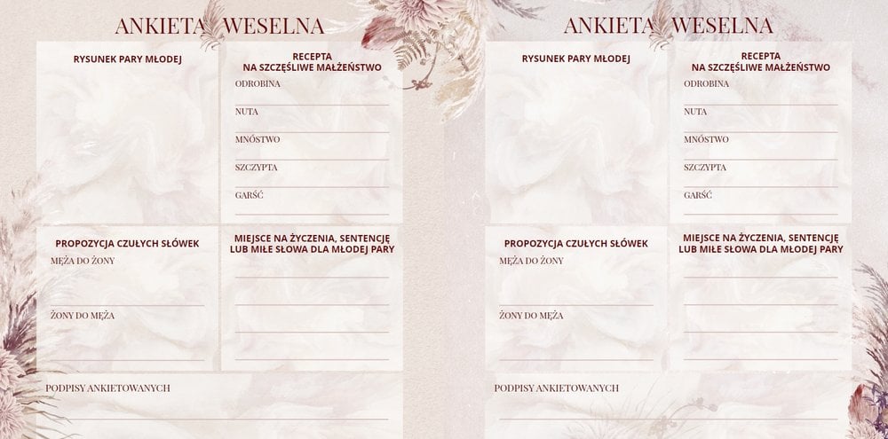 - 50 weselnych ankiet, zawierających krótkie pytania z miejscem na odpowiedzi oraz pole na rysunek Pary Młodej;