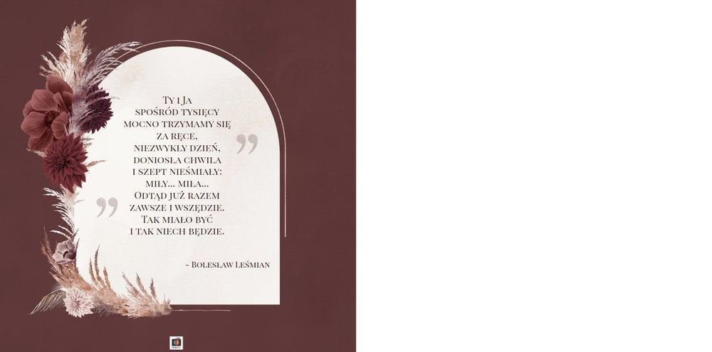 - miejsce z cytatem na ostatniej stronie projektu. Możesz zachować tam dowolny tekst - ulubioną sentencję, fragment piosenki, który jest dla Was ważny (przykładowo, korzystając z utworu wybranego na pierwszy taniec) lub motto, którym Ty i Twój partner się kierujecie;