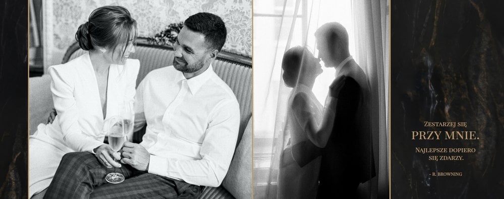 Szablon "Marmurowy album ślubny" to idealna propozycja dla osób ceniących elegancję z minimalizmem. Wypełniony ciemnymi, marmurowymi tłami oraz złotem na akcentach, podkreśli szyk każdej ślubnej fotografii. W szablonie główne skrzypce grają nowoczesne układy zdjęć oraz czułe teksty, które można dowolnie personalizować.