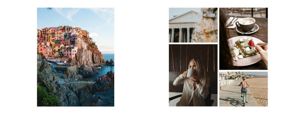 Z szablonem fotoksiążki "Minimalistyczne wakacje - Włochy" w szybki i łatwy sposób stworzysz idealną pamiątkę dla Twoich zdjęć z podróży do Włoch. Większość stron zajmują komórki zdjęciowe dostosowane pod pionowe zdjęcia z telefonu. Każdy układ jest również przygotowany pod różną ilość zdjęć, dzięki czemu bardzo łatwo jest dopasować szablon pod zarówno kilkudniowy city break, jak i dłuższy wyjazd na urlop. Minimalistyczny wygląd oraz estetyczne układy zdjęciowe dodają całości elegancji oraz sprawiają, że szablon staje się jeszcze bardziej uniwersalny.