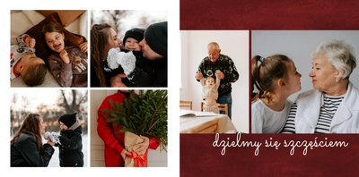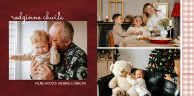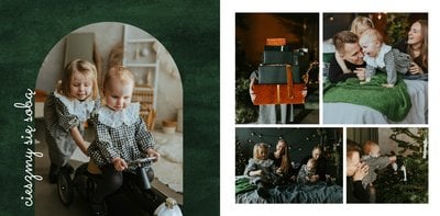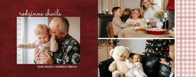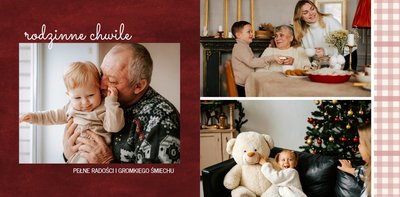 Fotoksiążka z szablonem "Minimalistyczny prezent na Święta" to idealna propozycja na tegoroczny prezent pod choinkę. Klasyczna kolorystyka - głęboka czerwień i butelkowa zieleń - podkreślą świąteczny charakter rodzinnych zdjęć. Minimalistyczne tła w postaci obrusowej kratki i weluru dodadzą całości elegancki wygląd, a polaroidowe dodatki wniosą delikatną nutę retro. Uzupełnij szablon fotoksiążki "Minimalistyczny prezent na Święta" rodzinnymi fotografiami - zarówno z sesji świątecznej, jak i codziennych chwil.
