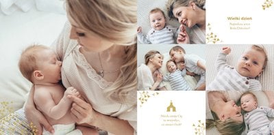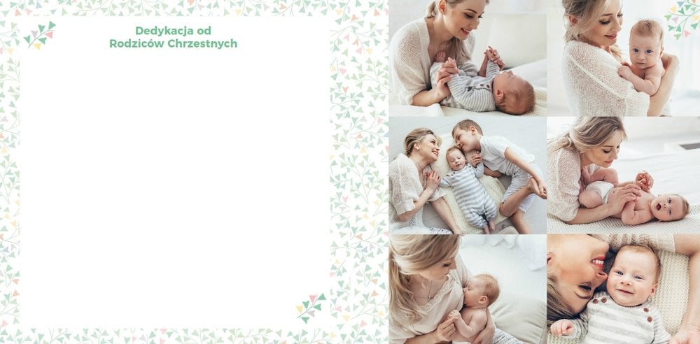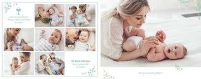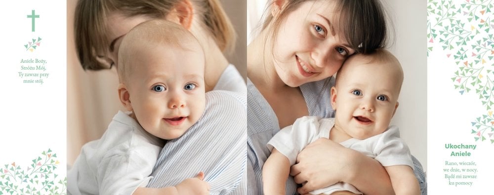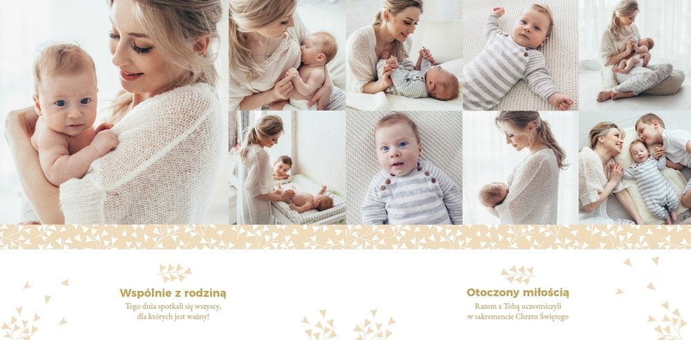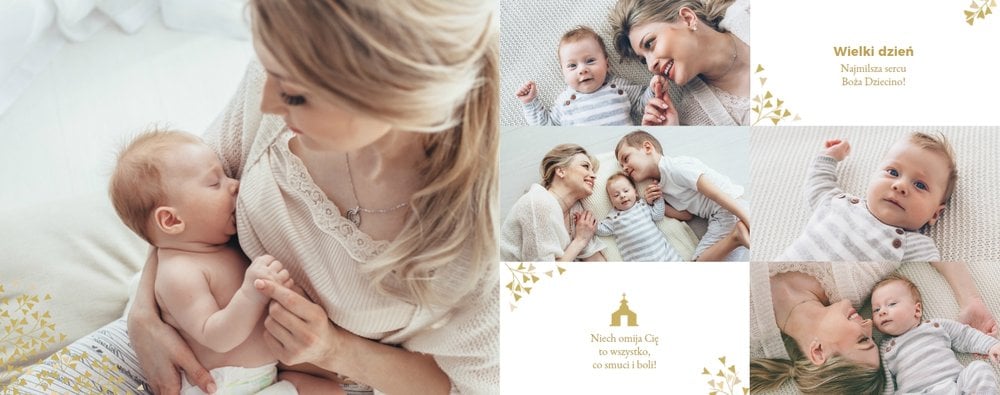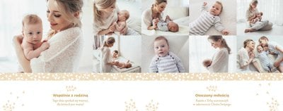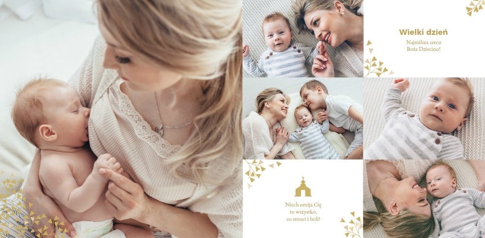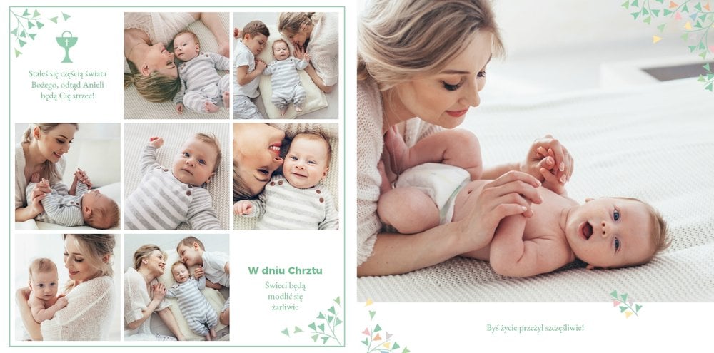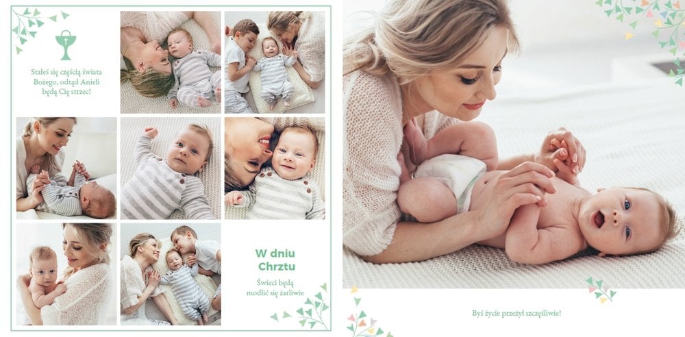 Z szablonem Mój pierwszy sakrament przygotujesz piękną pamiątkę z Chrztu Świętego Twojego dziecka lub stworzysz oryginalny prezent dla Chrześniaka. Przejrzyj foldery i przygotuj zdjęcia, z którymi zaprojektujesz wyjątkową fotoksiążkę. Z całą pewnością będzie ona pamiątką na wiele, wiele lat. Wnętrze szablonu zapewnia miejsca na piękne zdjęcia z sakramentu przyjęcia chrztu oraz wzruszające cytaty. Wszystko to sprawi, że fotoksiążka będzie wzruszać obdarowanych. Szablon Mój pierwszy sakrament to minimalistyczny szablon, w którym znajdziesz delikatne elementy graficzne oraz mnóstwo miejsca na fotografie z tego wielkiego dnia.