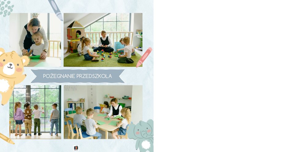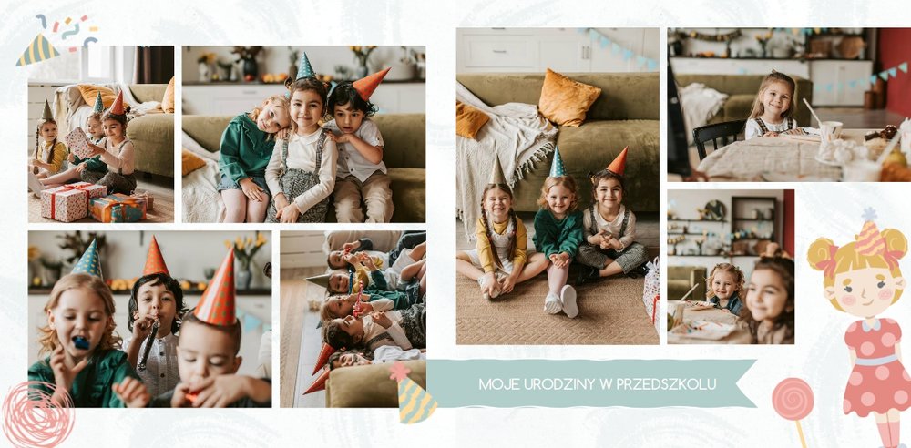 Z szablonem fotoksiążki “Moje wesołe przedszkole” sprawisz sobie i swojemu dziecku cudowną pamiątkę na lata. Wypełniony kolorowymi stronami oraz uroczymi dodatkami, zachęci niejedno dziecko do tworzenia, a następnie częstego przeglądania go razem z Tobą. Szablon został zaprojektowany z myślą o chronologicznym ułożeniu wydarzeń z przedszkola - od pasowania na przedszkolaka do pożegnania przedszkola. Kolorowe dodatki podkreślą radość dziecka na zdjęciach, a wybór pomiędzy wersją dziewczęcą a chłopięcą dodatku jeszcze bardziej spersonalizuje fotoksiążkę.