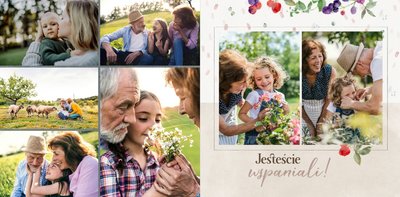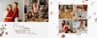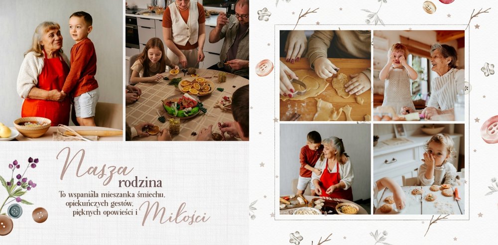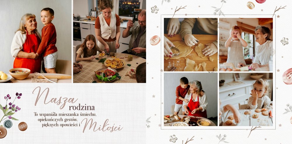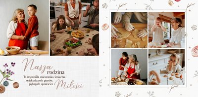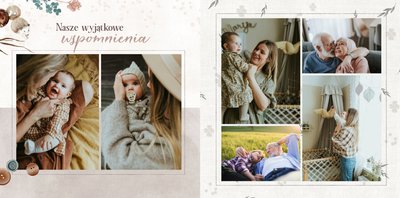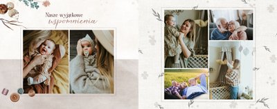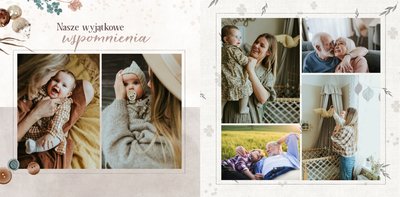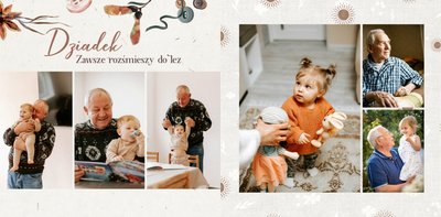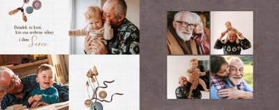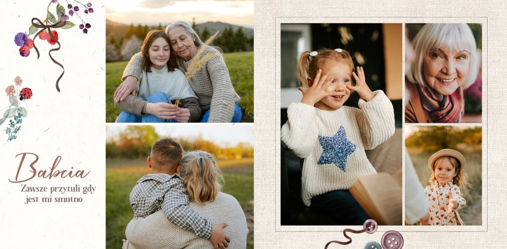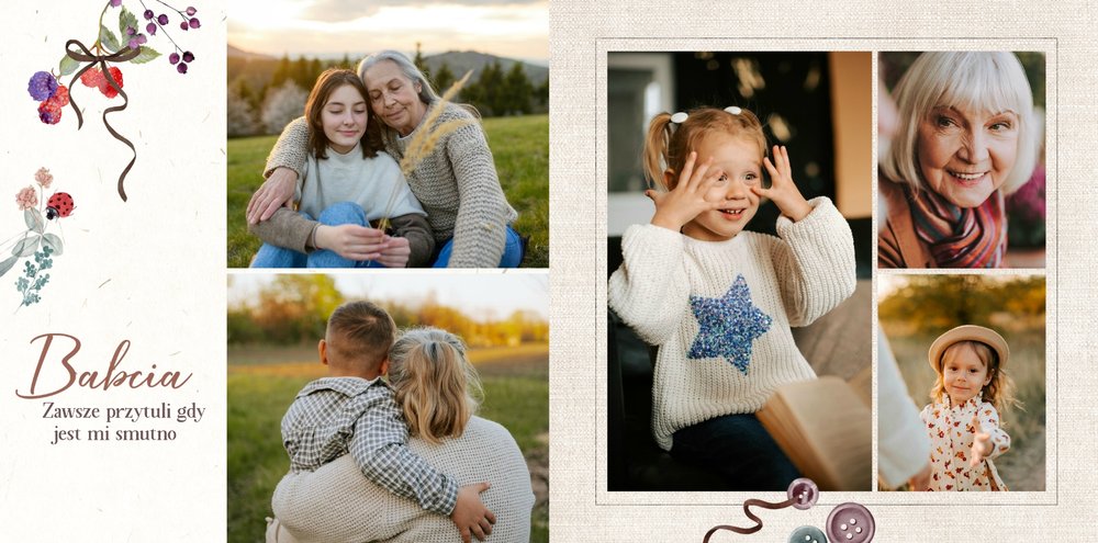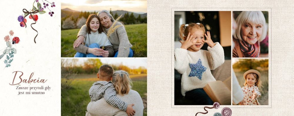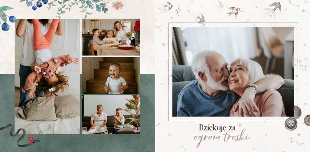 Szablon jest pełen uroku - każda strona posiada układ komórek zdjęciowych, przyozdobionych delikatnymi, kolorowymi rysunkami. Ozdobne tła i ilustracje w stylu boho i vintage idealnie współgrają ze zdjęciami Twojego dziecka. Wśród ilustracji wplecione zostały krótkie, czułe teksty, oddające wdzięczność i uczucia, które kierujemy do Babci i Dziadka. Szablon fotoksiążki "Na Dzień Babci i Dziadka" można swobodnie modyfikować, tak aby móc stworzyć spersonalizowaną pamiątkę od wnuków. To pomysł na prezent, który wzruszy każdą obdarowaną nim osobę, a zawarte w nim fotografie pozostaną z Wami na lata.