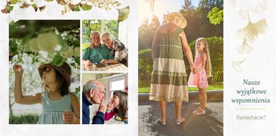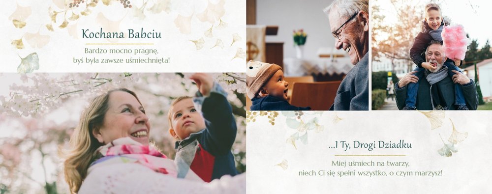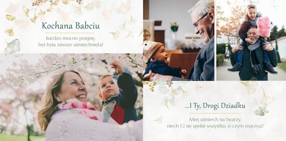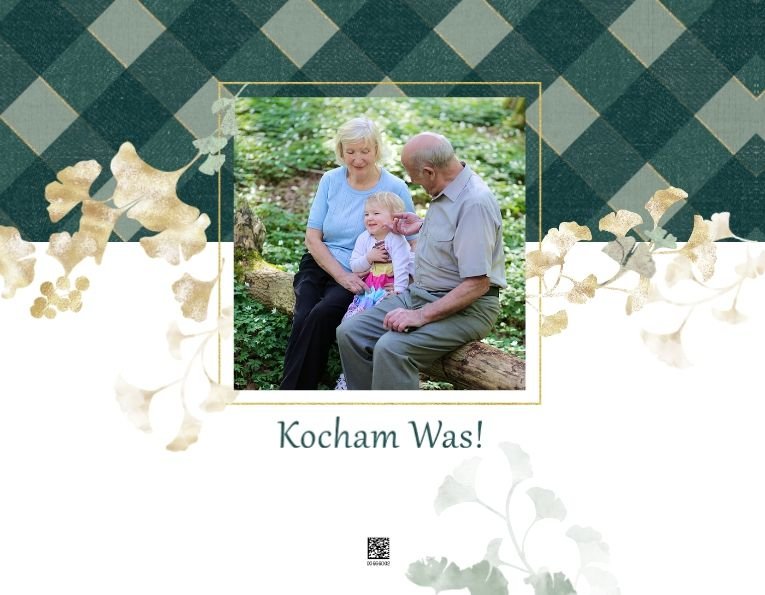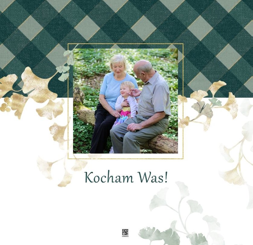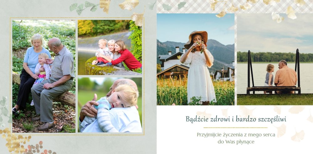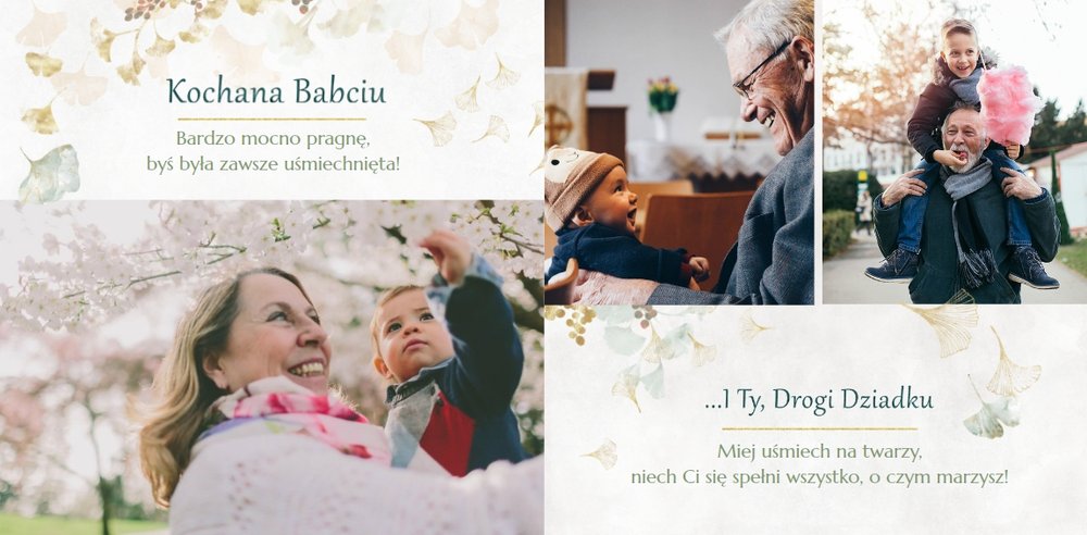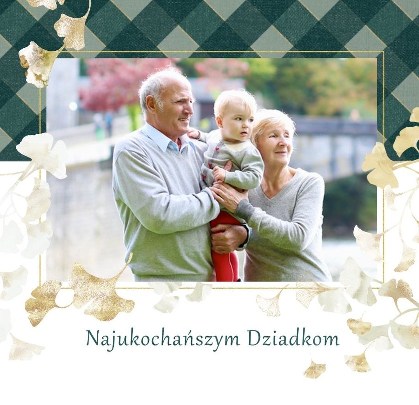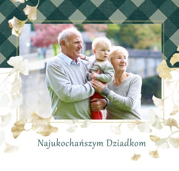 Szablon "Najukochańszym Dziadkom" to oryginalna kompozycja - połączenie ciemnej i eleganckiej kratki oraz wielobarwnego miłorzębu. Całość szablonu jest bardzo gustowna, co z całą pewnością przypadnie do gustu kochanym Dziadkom i idealnie wpasuje się w najzwyklejsze zdjęcia, również te z Twojego telefonu.