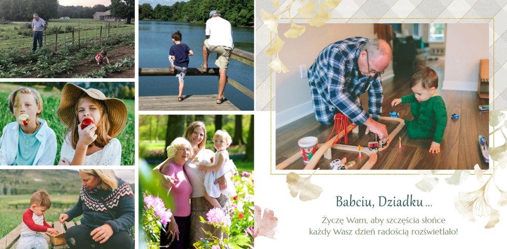 Szablon "Najukochańszym Dziadkom" to oryginalna kompozycja - połączenie ciemnej i eleganckiej kratki oraz wielobarwnego miłorzębu. Całość szablonu jest bardzo gustowna, co z całą pewnością przypadnie do gustu kochanym Dziadkom i idealnie wpasuje się w najzwyklejsze zdjęcia, również te z Twojego telefonu.