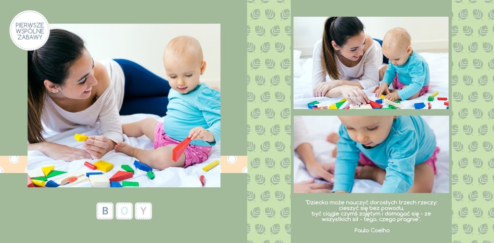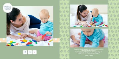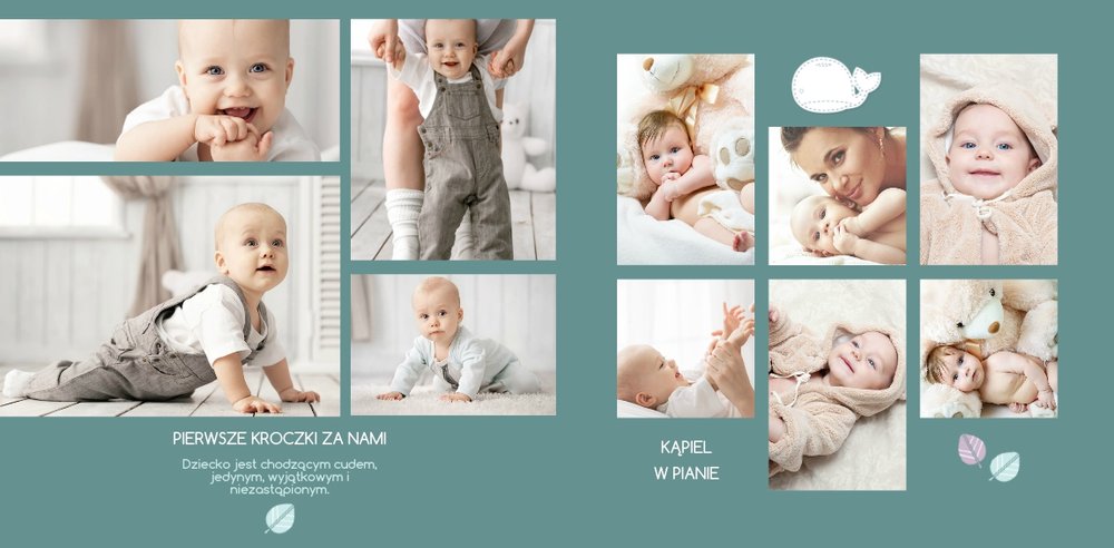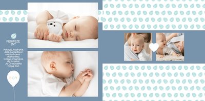 Szablon Nasz Kochany Synek to propozycja dla rodziców, którzy chcą stworzyć pamiątkę z pierwszych chwil dziecka na świecie. Piękna oprawa graficzna, uzupełniona ulubionymi kadrami i napisami będzie stanowić niepowtarzalną pamiątkę. Szablon utrzymany jest w delikatnych pastelowych kolorach z przewagą koloru niebieskiego i zielonego, co czyni go idealnym dla synka.