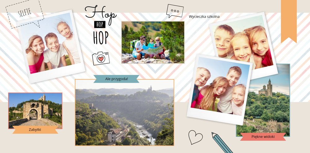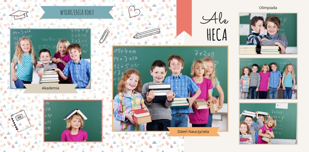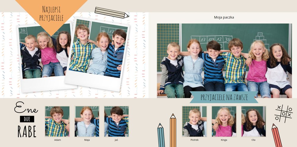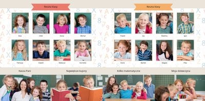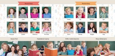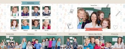 Historie ze szkolnej ławki zasługują na uwiecznienie, dlatego przygotowaliśmy szablon Nasza klasa, który pozwoli stworzyć wyjątkową fotoksiążkę szkolną Twojego dziecka. W szablonie znajduje się dziecięca typografia ze szkolnymi wierszykami i powiedzeniami, specjalne miejsce na szkolne prace oraz tablica ze zdjęciami kolegów z klasy. Wszystko to ułożone na beżowym tle z akcentami kolorów niebieskiego, czerwonego i żółtego. Ozdobne cyfry, litery i strony z zeszytu pozwolą pięknie oprawić zdjęcia ze szkolnej ławki. Fotoksiążka szkolna to idealny pomysł na podsumowanie roku każdego ucznia.