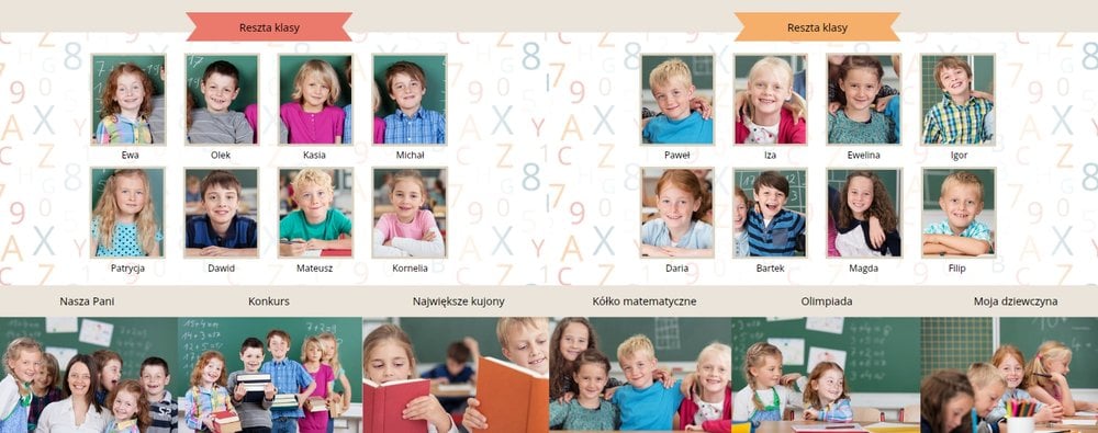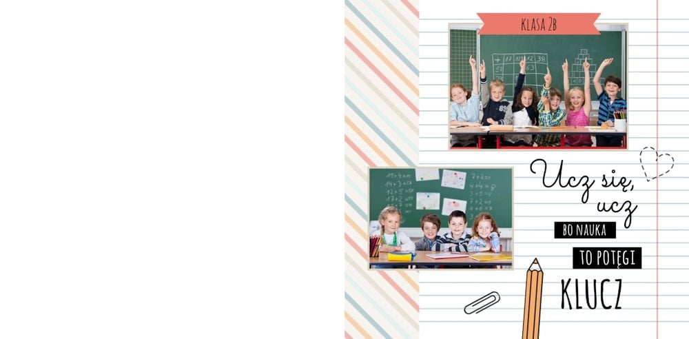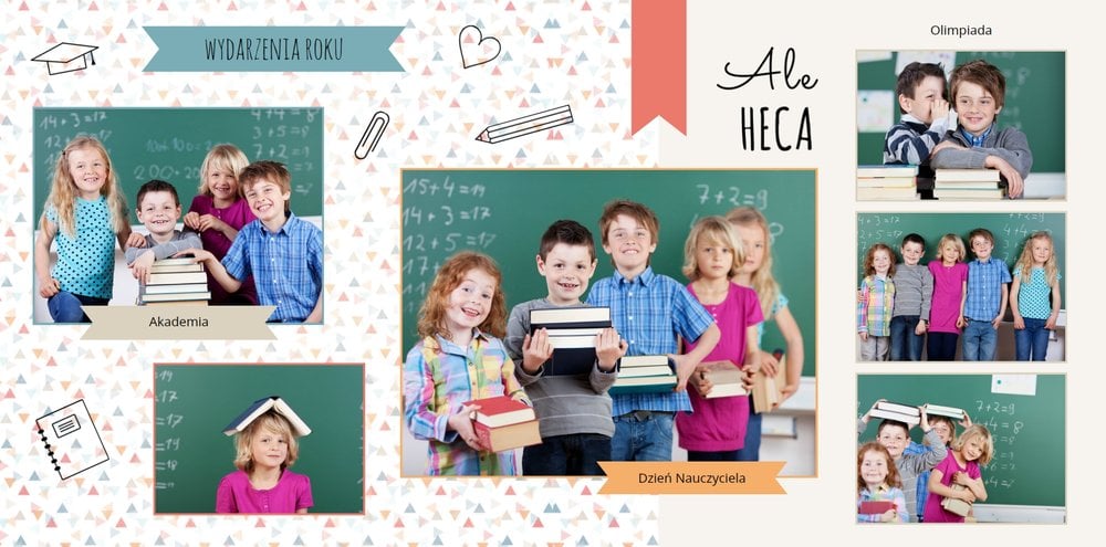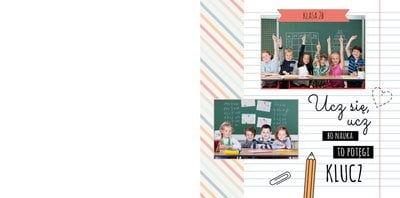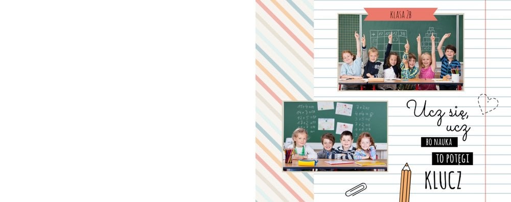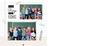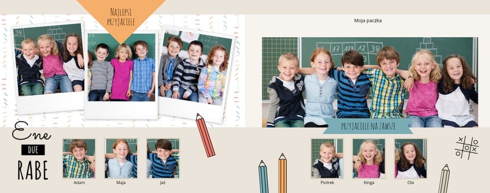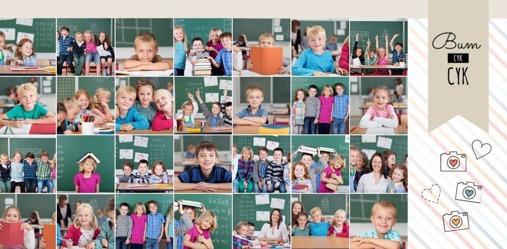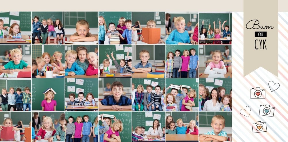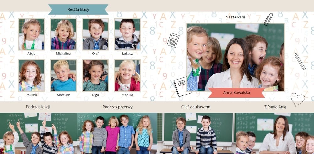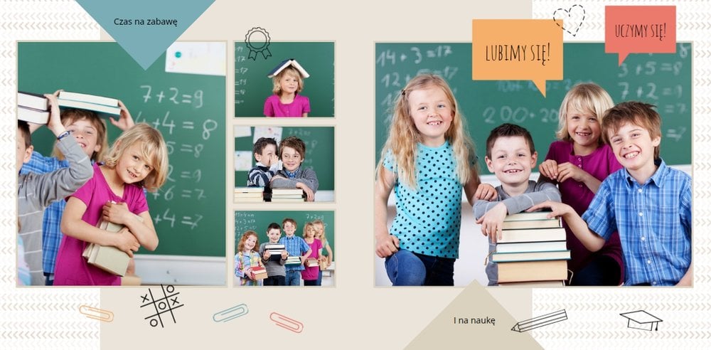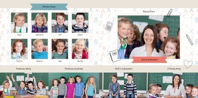 Historie ze szkolnej ławki zasługują na uwiecznienie, dlatego przygotowaliśmy szablon Nasza klasa, który pozwoli stworzyć wyjątkową fotoksiążkę szkolną Twojego dziecka. W szablonie znajduje się dziecięca typografia ze szkolnymi wierszykami i powiedzeniami, specjalne miejsce na szkolne prace oraz tablica ze zdjęciami kolegów z klasy. Wszystko to ułożone na beżowym tle z akcentami kolorów niebieskiego, czerwonego i żółtego. Ozdobne cyfry, litery i strony z zeszytu pozwolą pięknie oprawić zdjęcia ze szkolnej ławki. Fotoksiążka szkolna to idealny pomysł na podsumowanie roku każdego ucznia.