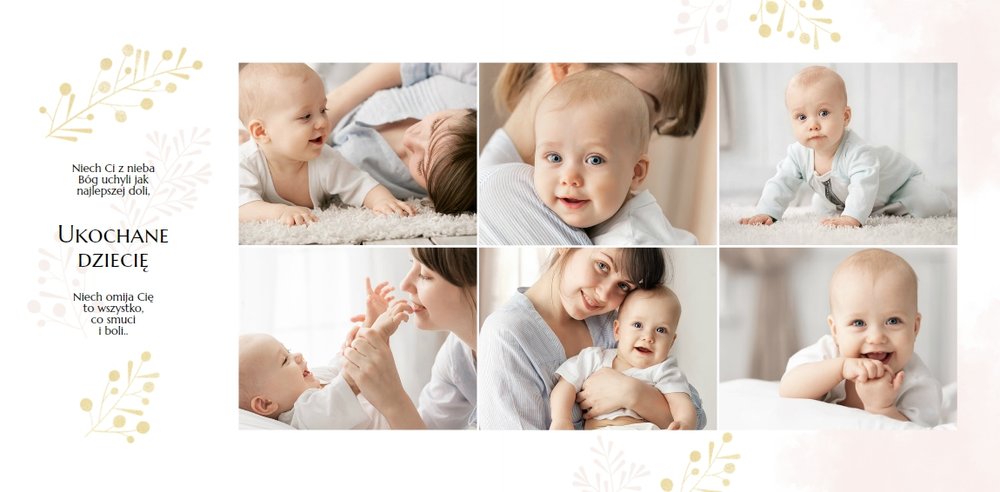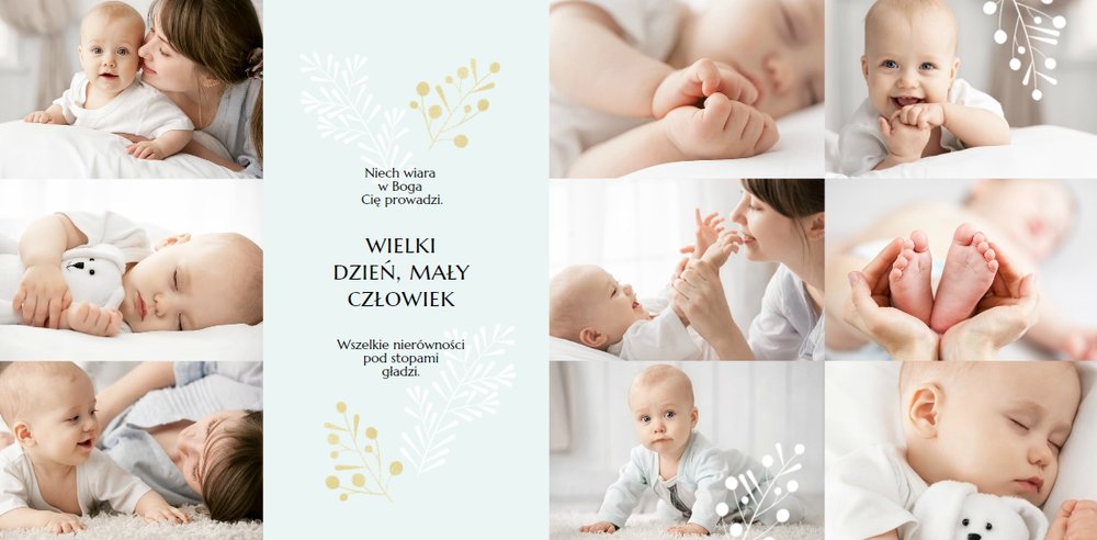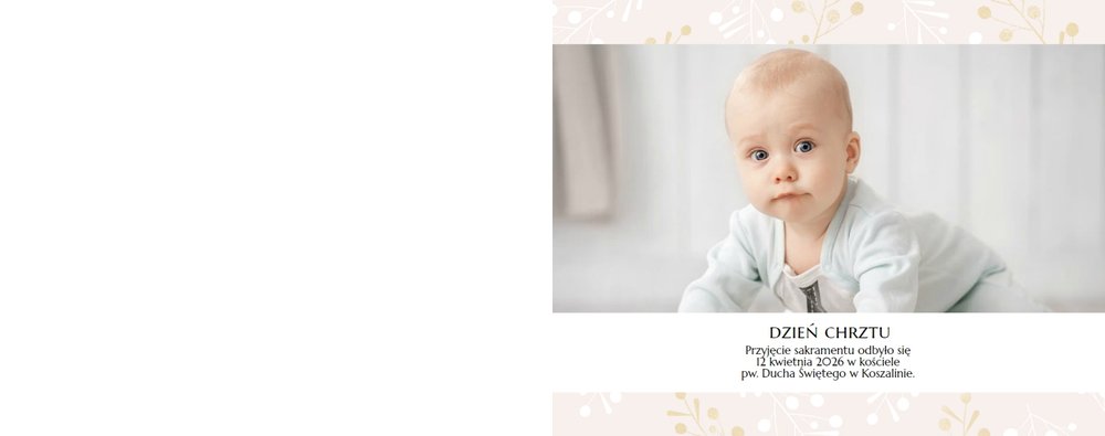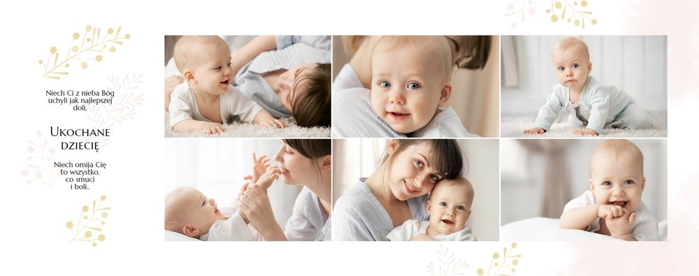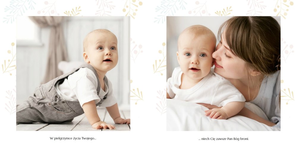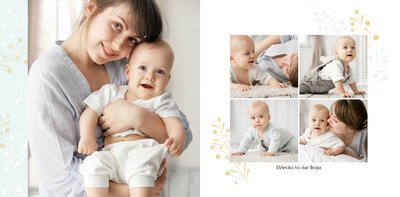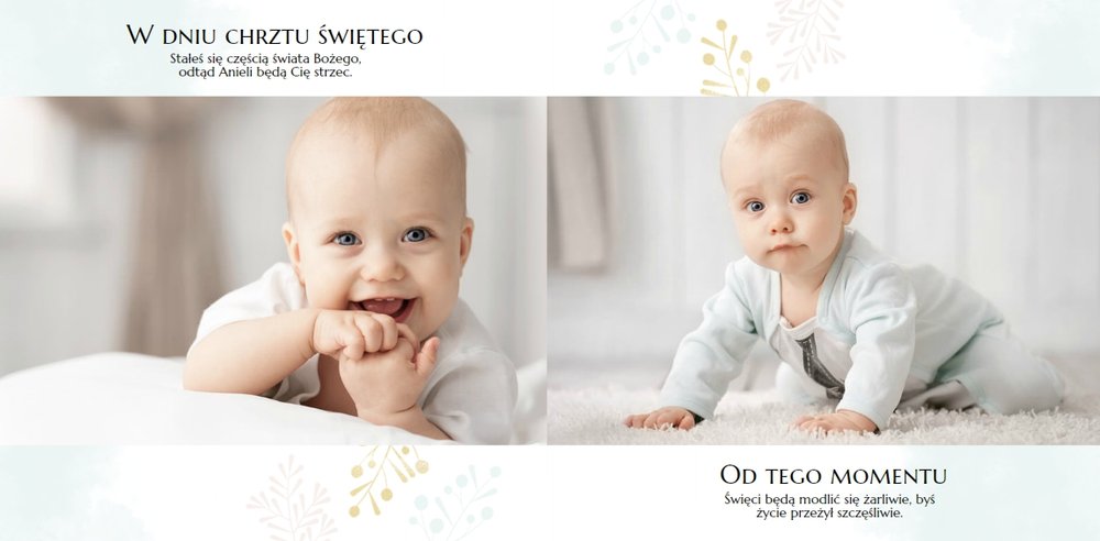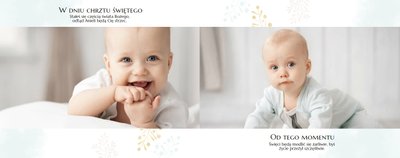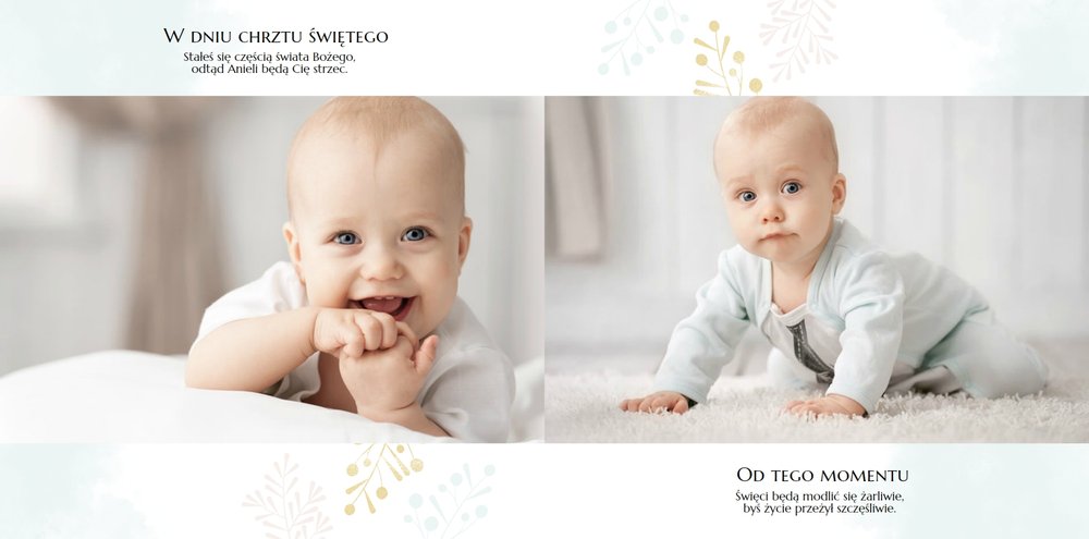Chrzest to wydarzenie, które budzi emocje w rodzicach oraz w całej rodzinie zaangażowanej w uroczystość chrzcin. Zdecyduj się na podsumowanie tego wyjątkowo rodzinnego wydarzenia w fotoksiążce z szablonem Pamiątka Chrztu Świętego Dla Chłopca. Szablon zachowa rodzinne wspomnienia zamknięte w minimalistycznej formie oraz na kartach w pastelowymi i złotymi elementami graficznymi. Wewnątrz pamiątki chrztu znajduje się mnóstwo ramek na ulubione ujęcia oraz miejsce na najważniejsze informacje.