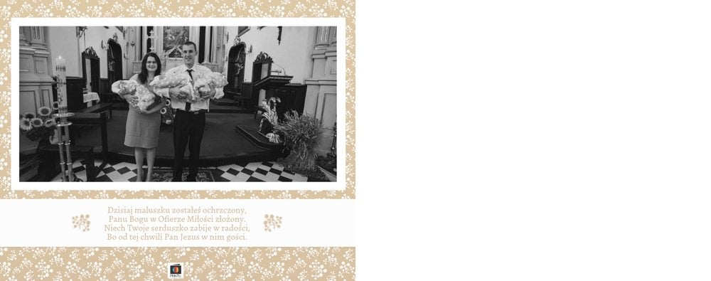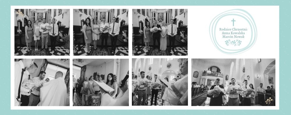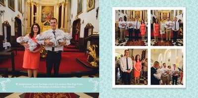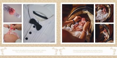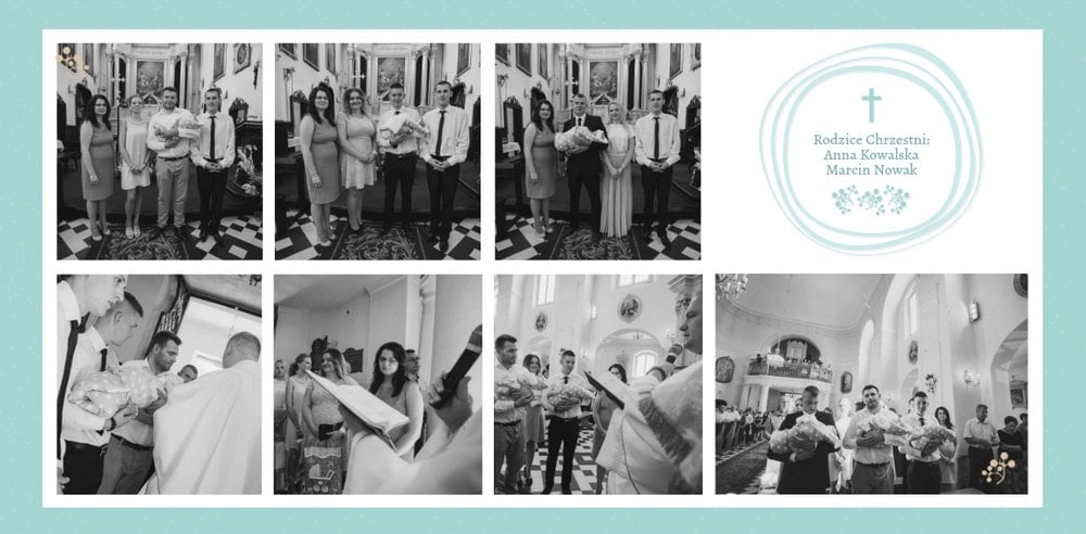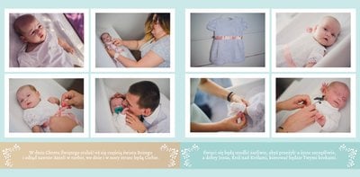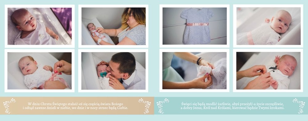 Chrzest Święty to szczególna uroczystość w życiu całej rodziny, która wymaga wyjątkowej oprawy. Zaprojektuj fotoksiążkę z szablonem Pamiątka Chrztu Świętego. W szablonie dominują delikatne kolory – niebieski oraz beż. Projekt z elegancką ornamentyką pięknie skomponuje się ze zdjęciami z uroczystości. Szablon idealny jako pamiątka Chrzcin zarówno dziewczynki, jak i chłopca.