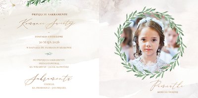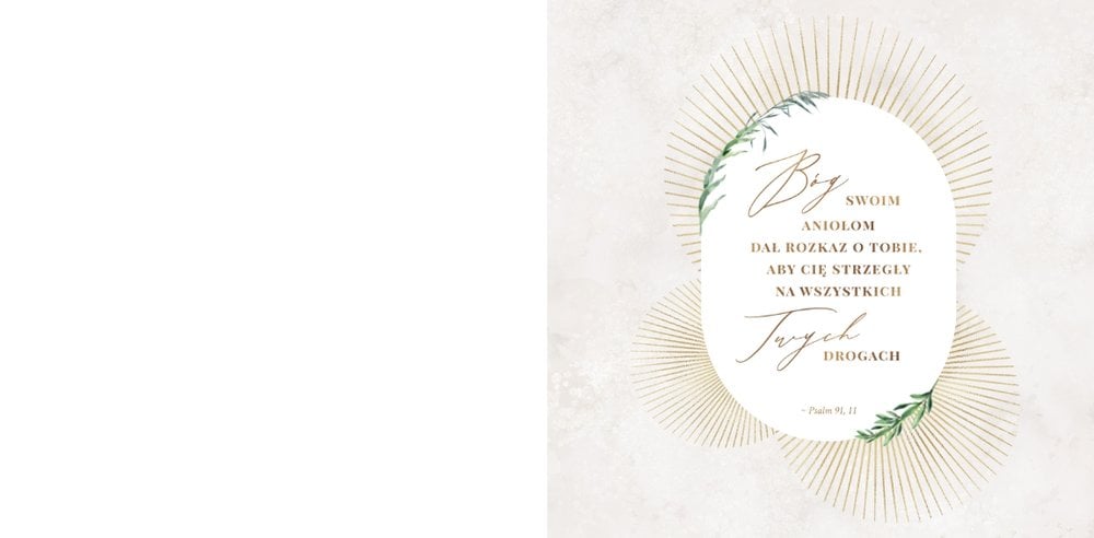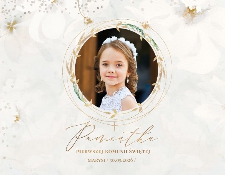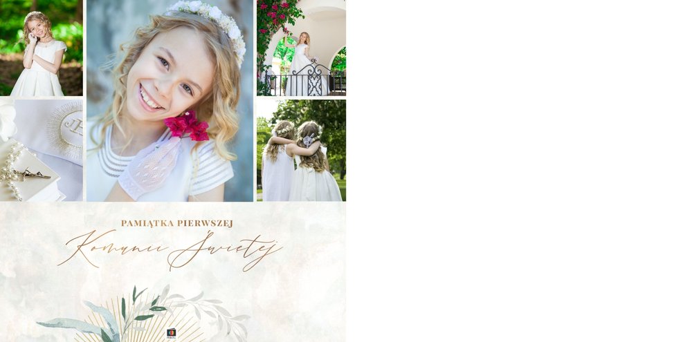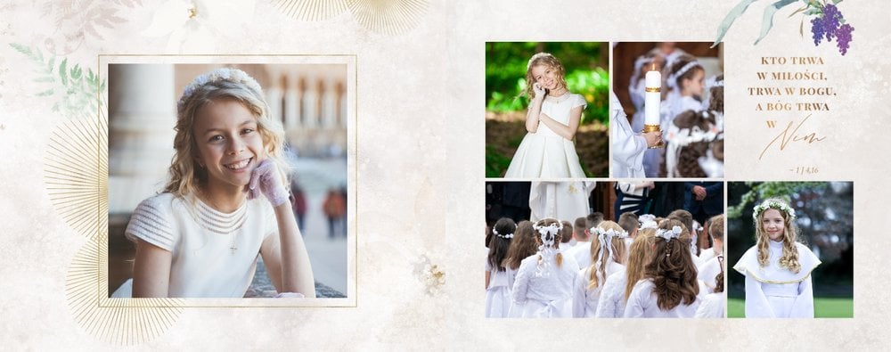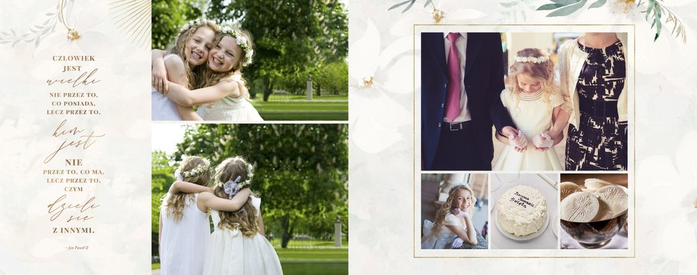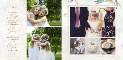 Delikatna, kremowa kolorystyka szablonu stanowi idealną bazę dla zdjęć z uroczystości. Uzupełnieniem oprawy graficznej fotoksiążki są złote ornamenty i subtelne motywy roślinne.