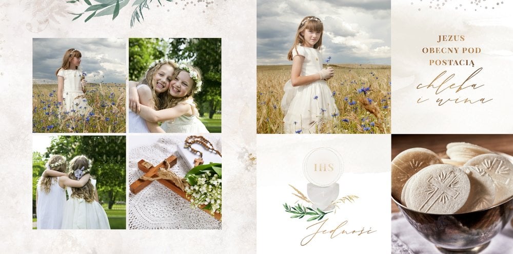 Szablon "Pamiątka I Komunii Świętej" tworzy zbiór wspomnień z wyjątkowego dnia sakramentu przyjęcia pierwszej eucharystii. Pozwala w elegancki sposób nie tylko zachować zdjęcia, ale i upamiętnić wszystkie ważne informacje związane z ceremonią. W szablonie nie brakuje również wzniosłych cytatów i sentencji sakralnych, które podkreślają wagę wydarzenia.