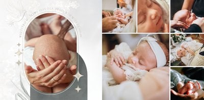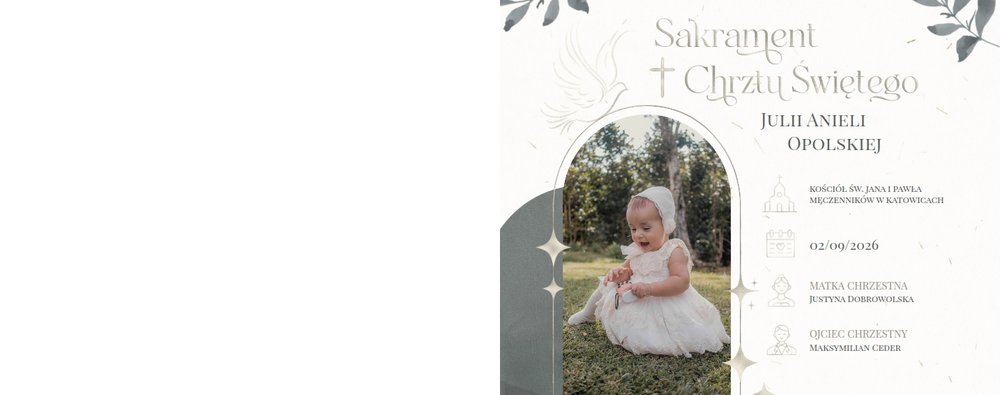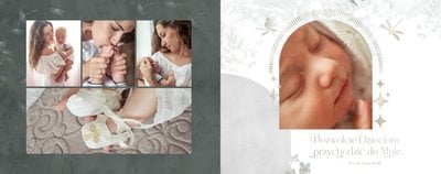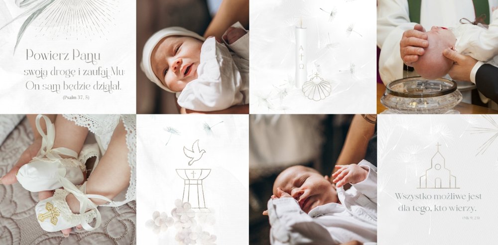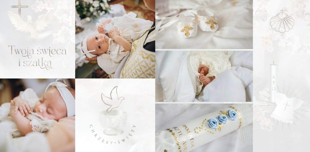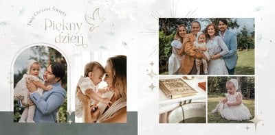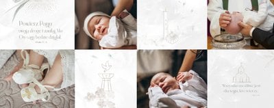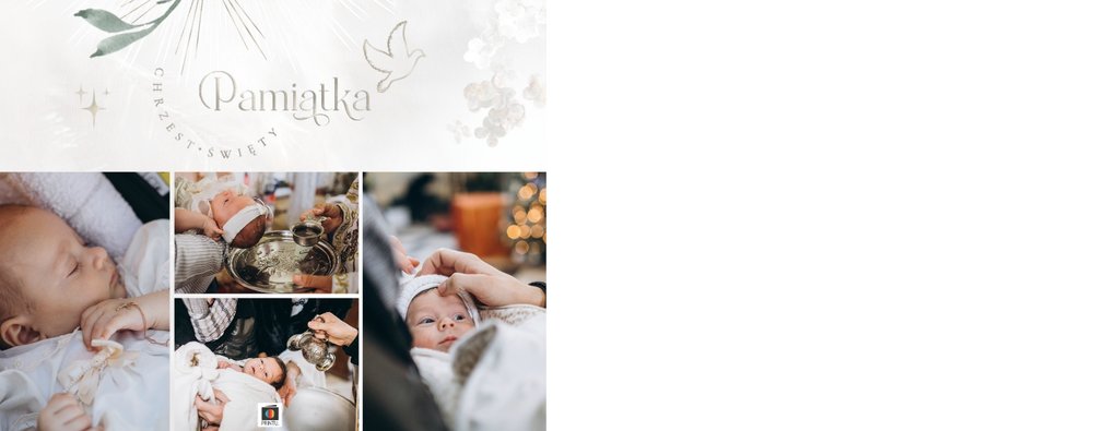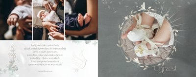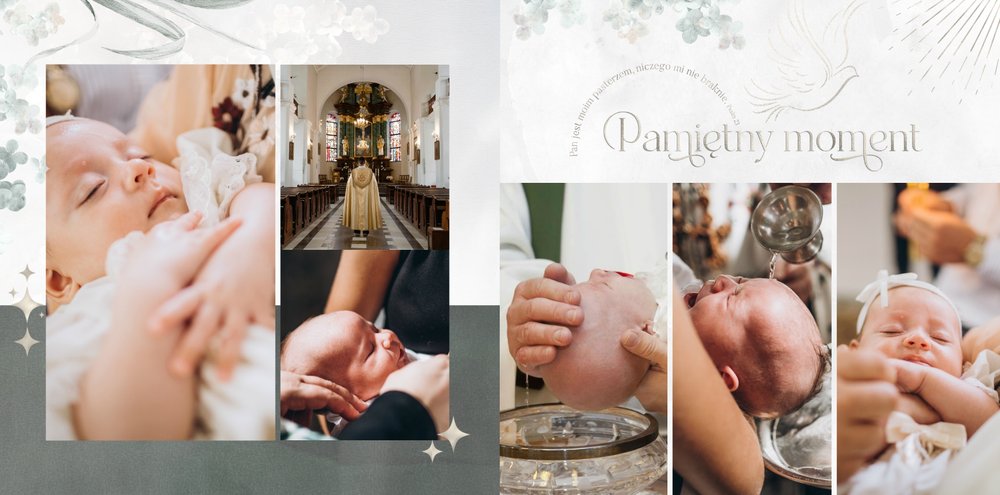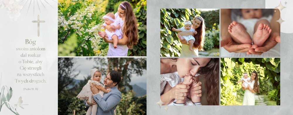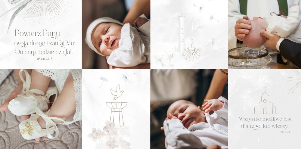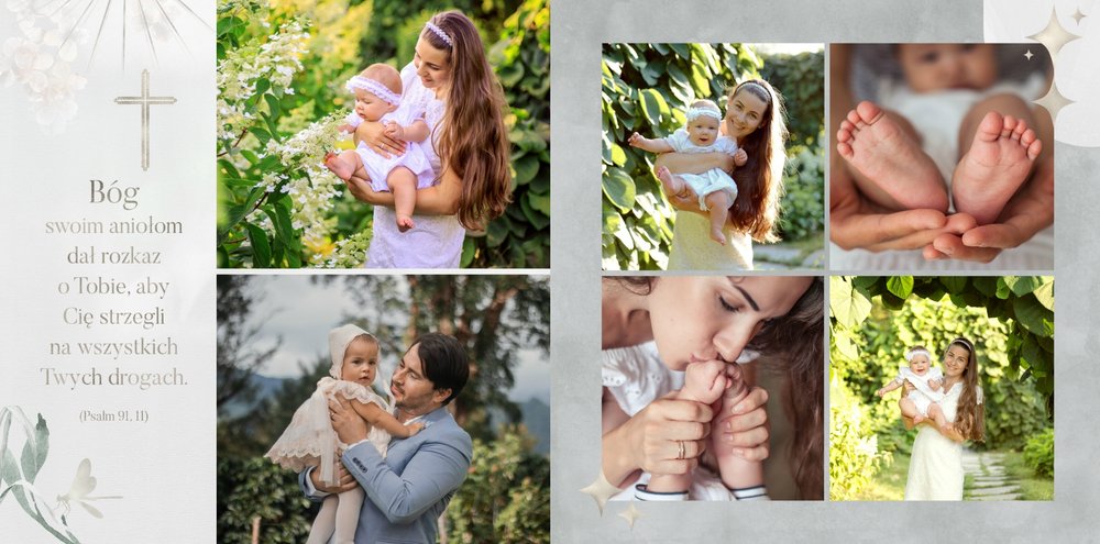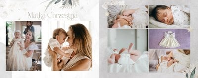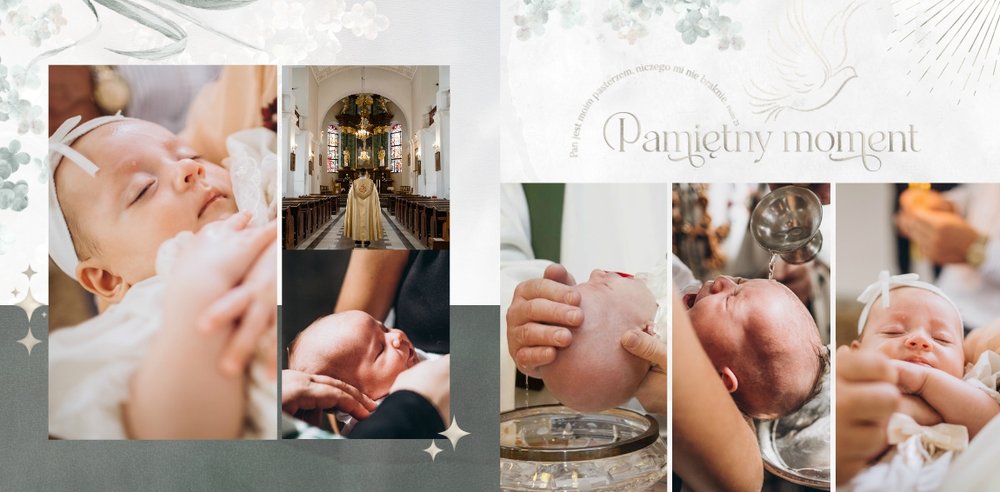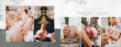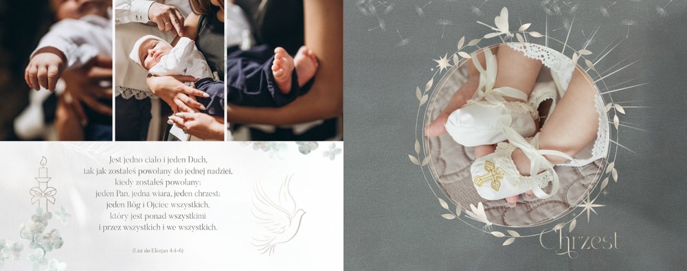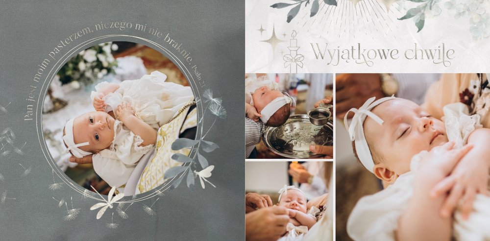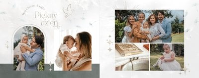 "Pamiątka sakramentu Chrztu Świętego" stanowi opowieść - począwszy od informacji o miejscu i dniu odbytego sakramentu, poprzez prezentację Rodziców Chrzestnych oraz symboli wydarzenia - świecy i szatki Twojego maluszka. W projekcie nie brak również miejsc na zdjęcia z samej ceremonii oraz spotkania w gronie bliskich. Zarówno ujęcia zbiorowe, jak i indywidualne portrety maluszka oraz gości pozostaną idealnie zaprezentowane.