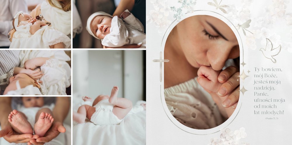 Jeśli jednak pragniesz nadać pamiątce niepowtarzalnej formy to nic nie stoi na przeszkodzie, by całkowicie ją przekształcić! Masz możliwość dodawania, przesuwania oraz usunięcia każdego dodatku, zmiany tła czy zwiększenia lub zmniejszenia liczby stron. Wnętrze projektu pełne jest cytatów i fragmentów Ewangelii, Psalmów oraz Pisma Świętego, które dodają głębi i emocji fotoksiążce.