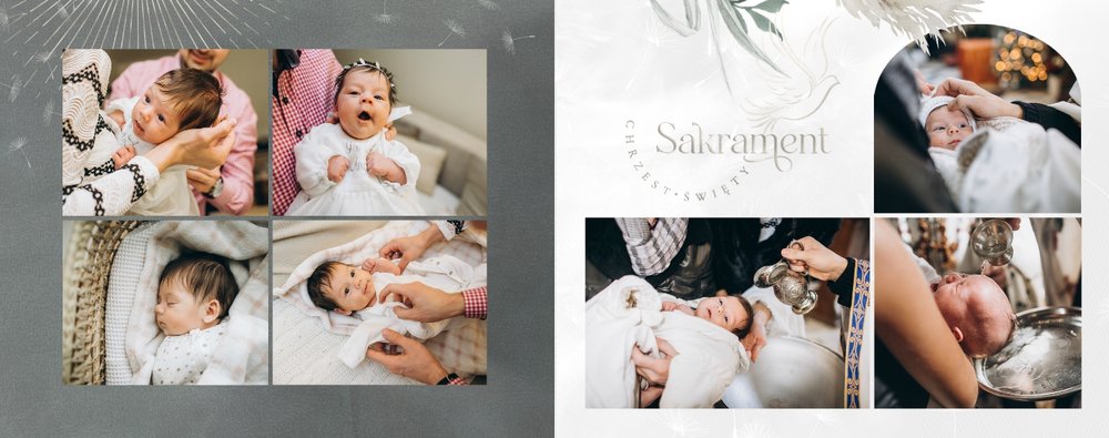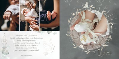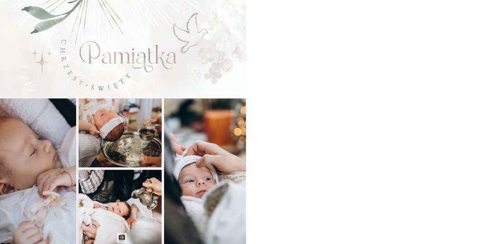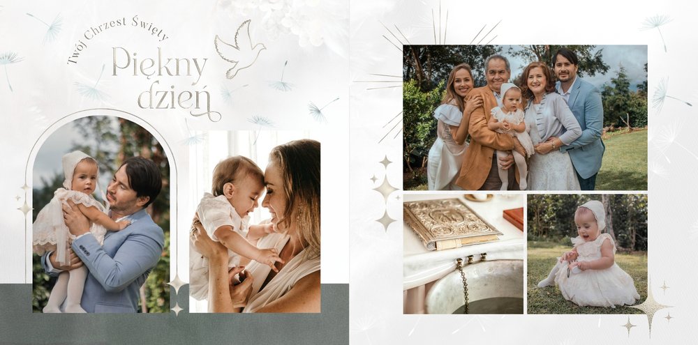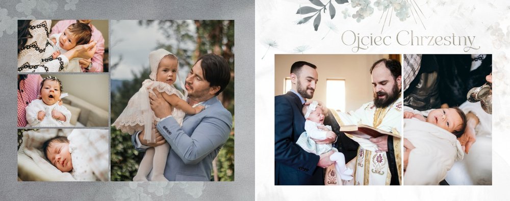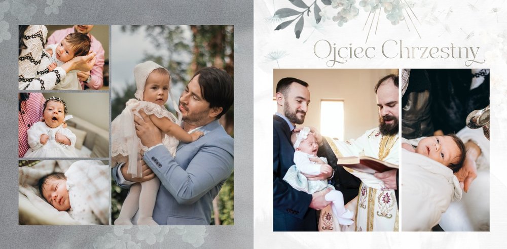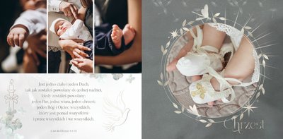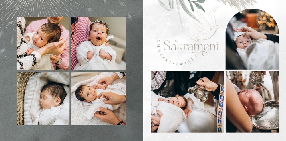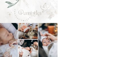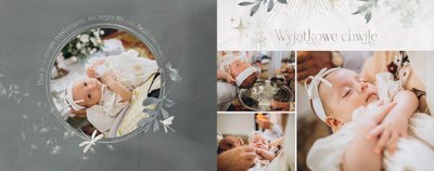 "Pamiątka sakramentu Chrztu Świętego" stanowi opowieść - począwszy od informacji o miejscu i dniu odbytego sakramentu, poprzez prezentację Rodziców Chrzestnych oraz symboli wydarzenia - świecy i szatki Twojego maluszka. W projekcie nie brak również miejsc na zdjęcia z samej ceremonii oraz spotkania w gronie bliskich. Zarówno ujęcia zbiorowe, jak i indywidualne portrety maluszka oraz gości pozostaną idealnie zaprezentowane.