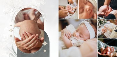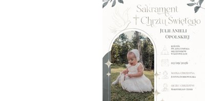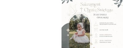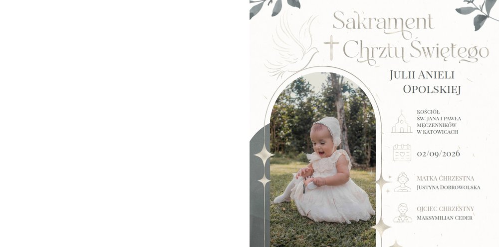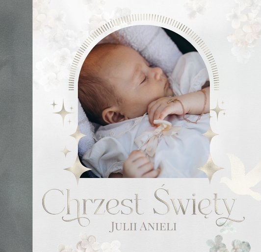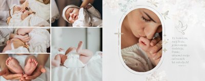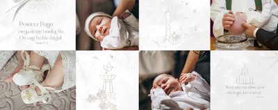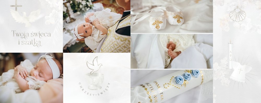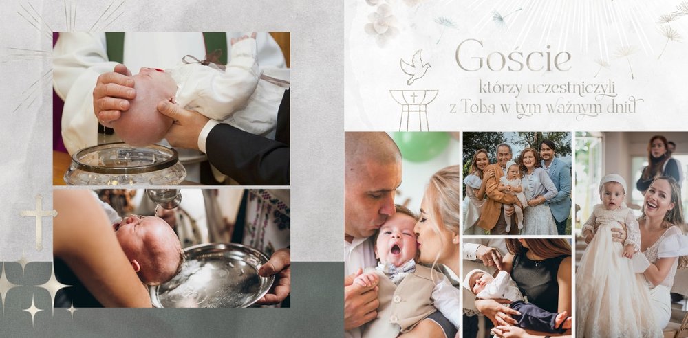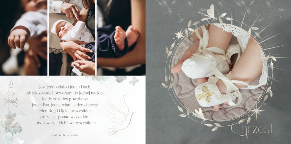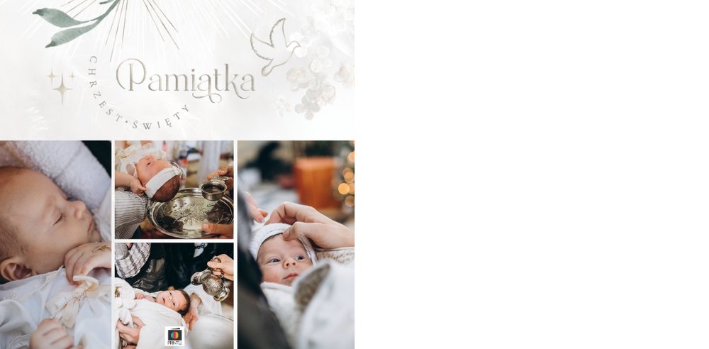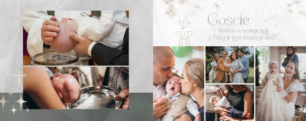 "Pamiątka sakramentu Chrztu Świętego" stanowi opowieść - począwszy od informacji o miejscu i dniu odbytego sakramentu, poprzez prezentację Rodziców Chrzestnych oraz symboli wydarzenia - świecy i szatki Twojego maluszka. W projekcie nie brak również miejsc na zdjęcia z samej ceremonii oraz spotkania w gronie bliskich. Zarówno ujęcia zbiorowe, jak i indywidualne portrety maluszka oraz gości pozostaną idealnie zaprezentowane.