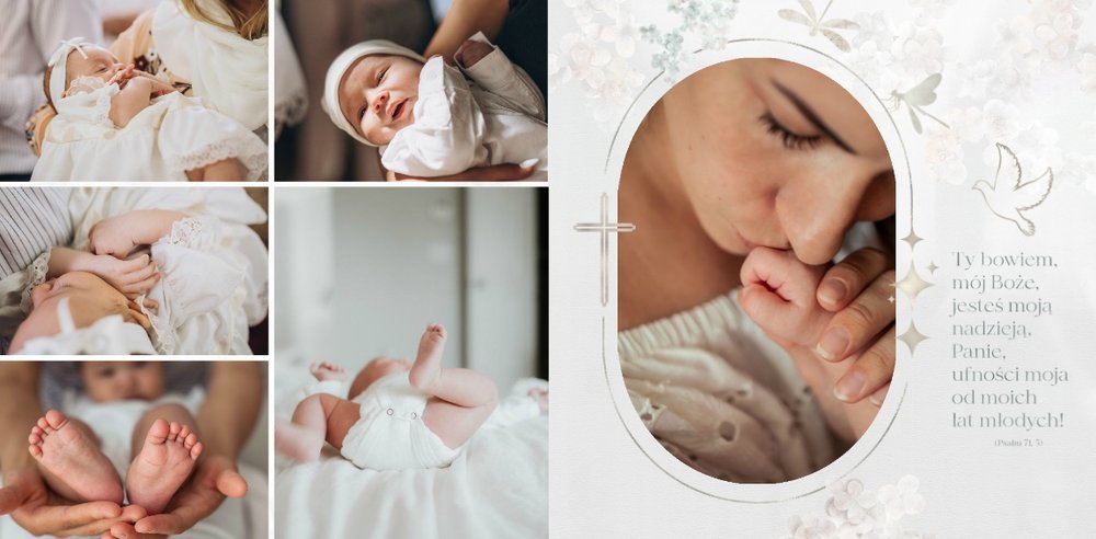 Jeśli jednak pragniesz nadać pamiątce niepowtarzalnej formy to nic nie stoi na przeszkodzie, by całkowicie ją przekształcić! Masz możliwość dodawania, przesuwania oraz usunięcia każdego dodatku, zmiany tła czy zwiększenia lub zmniejszenia liczby stron. Wnętrze projektu pełne jest cytatów i fragmentów Ewangelii, Psalmów oraz Pisma Świętego, które dodają głębi i emocji fotoksiążce.