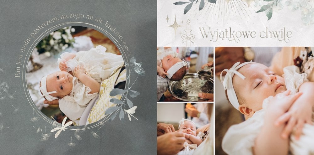 "Pamiątka sakramentu Chrztu Świętego" stanowi opowieść - począwszy od informacji o miejscu i dniu odbytego sakramentu, poprzez prezentację Rodziców Chrzestnych oraz symboli wydarzenia - świecy i szatki Twojego maluszka. W projekcie nie brak również miejsc na zdjęcia z samej ceremonii oraz spotkania w gronie bliskich. Zarówno ujęcia zbiorowe, jak i indywidualne portrety maluszka oraz gości pozostaną idealnie zaprezentowane.