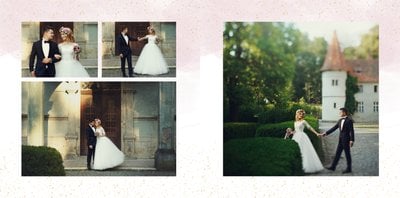 Fotoksiążka ze zdjęciami ślubnymi nie musi być banalna - pastelowe tła i złote elementy graficzne dodadzą uroku całości. Wraz z delikatnym szablonem idealnie komponować będą się momenty sprzed ślubnego kobierca, ale także fotografie z przyjęcia weselnego. Stonowane kolory różu i bieli oraz modne, pozłacane elementy sprawią, że pamiątka ze ślubu w postaci fotoksiążki stanie się oryginalna. Fotoksiążka z szablonem "X" to również wyjątkowy pomysł na prezent dla gości weselnych, dziadków oraz rodziców chrzestnych.