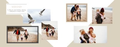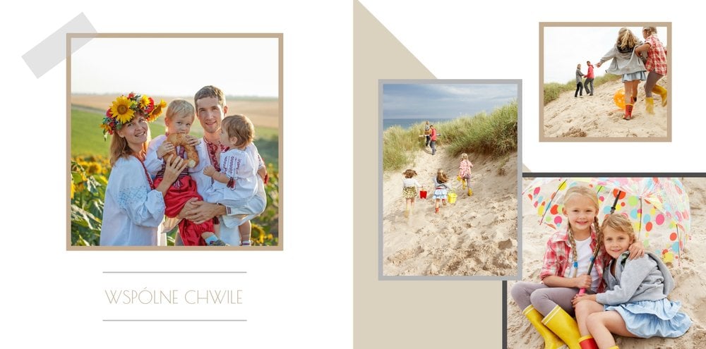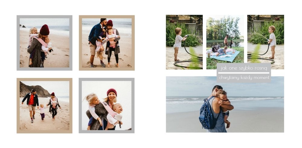Chcesz stworzyć szablon, którego z pewnością nikt jeszcze nie posiada? Nic prostszego! Wybierz ulubione fotografie i zaprojektuj pustą przestrzeń. Możesz dowolnie modyfikować tła, układy stron i teksty. Daj się ponieść wyobraźni i stwórz z Printu niepowtarzalną pamiątkę! Szablon Piękne wspomnienia jest uniwersalny, postawiliśmy na delikatną kolorystykę – białe tła, beżowe i szare dodatki, które idealnie skomponują się z Twoimi fotografiami.
