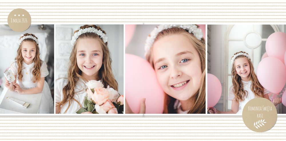Możesz zadecydować o kolorystyce, sposobie rozmieszczenia zdjęć, detalach graficznych, podpisach, rodzaju papieru oraz rozmiarze unikalnej fotoksiążki; komunia święta zostanie przedstawiona tak, jak chcesz.
