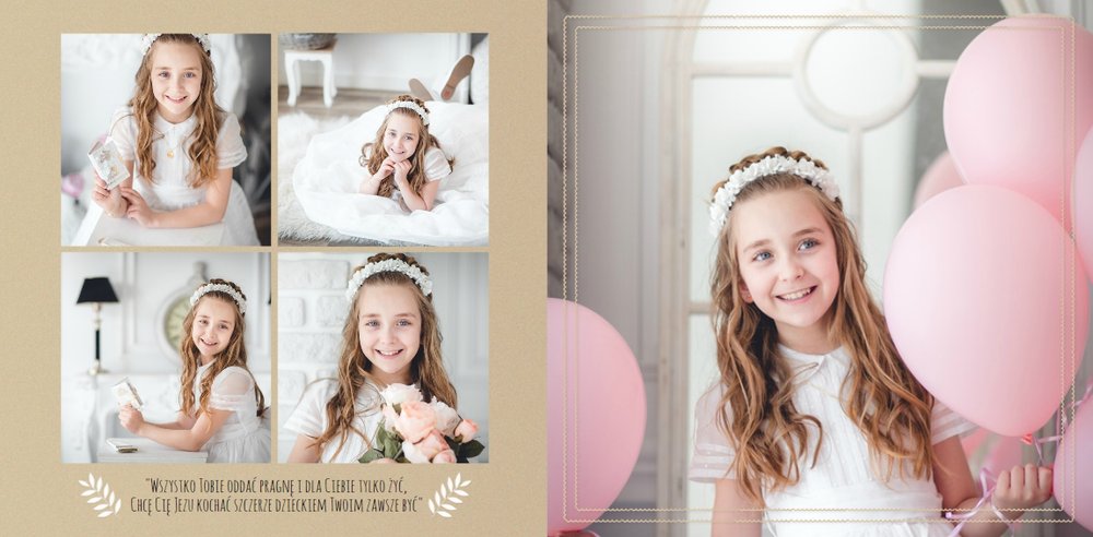 Możesz zadecydować o kolorystyce, sposobie rozmieszczenia zdjęć, detalach graficznych, podpisach, rodzaju papieru oraz rozmiarze unikalnej fotoksiążki; komunia święta zostanie przedstawiona tak, jak chcesz.