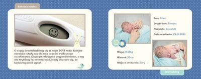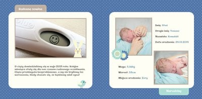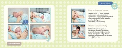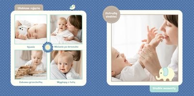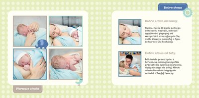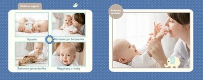 Szablon Pierwsze Chwile to fotoksiążka pamiątkowa, która w piękny sposób dokumentuje 12 miesięcy życia dziecka. Zawiera kolorowe i subtelne tła, dekoracje kwiatowe oraz postacie uroczych zwierzątek. Taki pamiętnik pierwszego roku życia będzie idealny zarówno dla dziewczynki i chłopca.