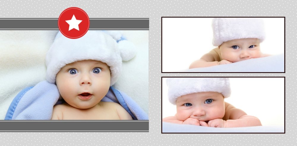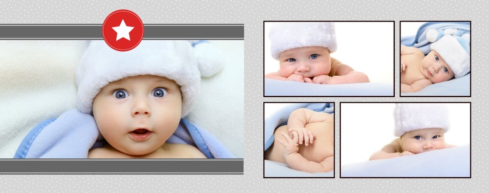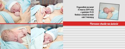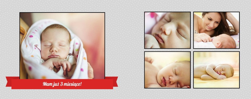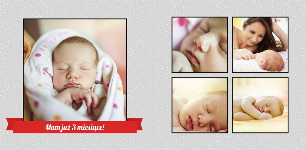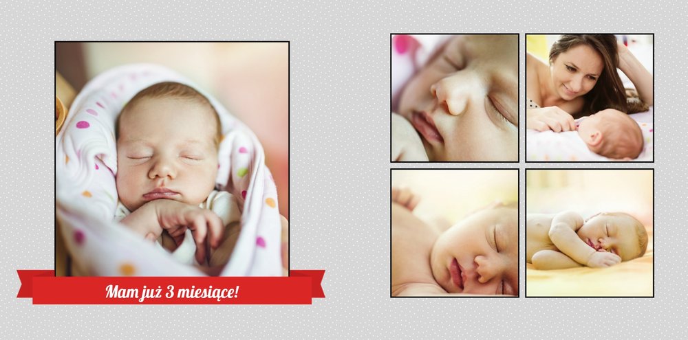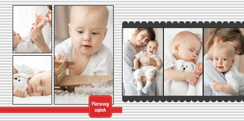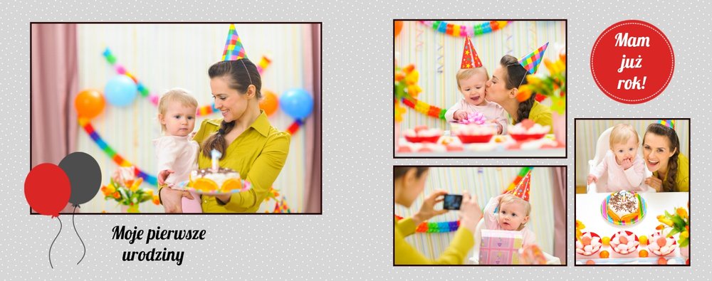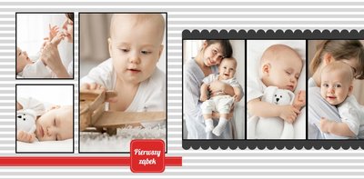 Szablon Pierwszy Roczek to propozycja dla rodziców, którzy chcą uwiecznić pierwsze ważne momenty życia dziecka, takie jak pierwsza kąpiel, pierwsze minki, pierwszy ząbek, pierwsze kroki, pierwsze urodziny. Szablon utrzymany jest w kolorystyce szaro-czerwonej. Idealny jako kronika pierwszego roku życia dla dziewczynki i chłopca.