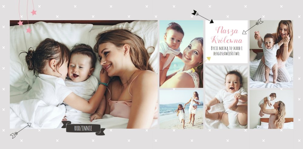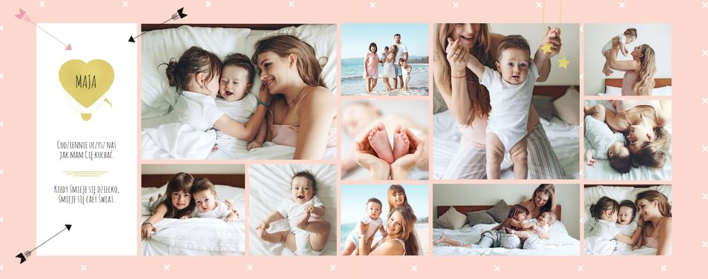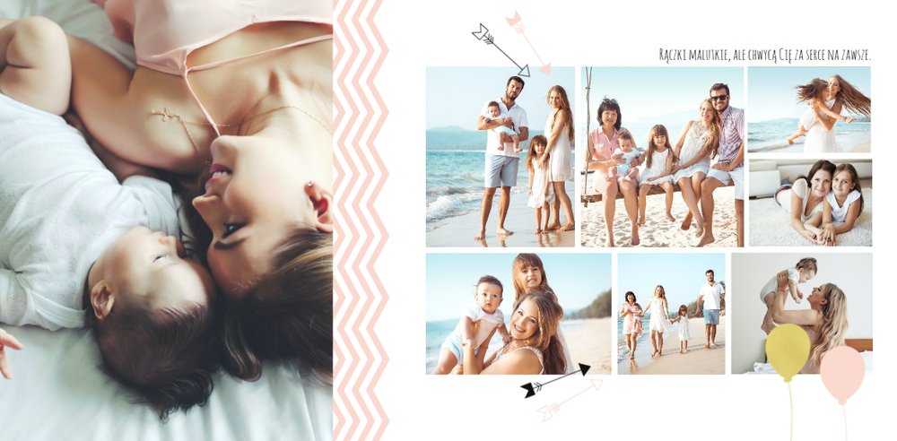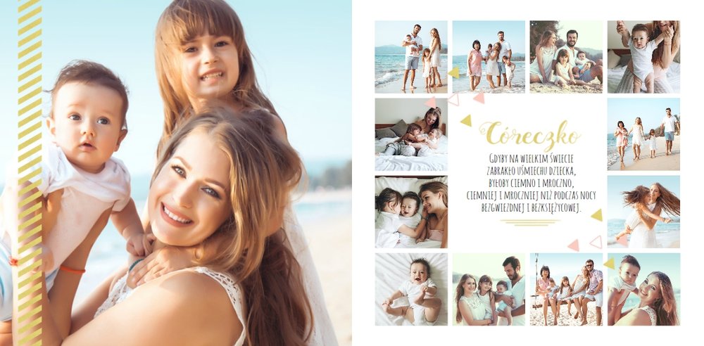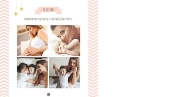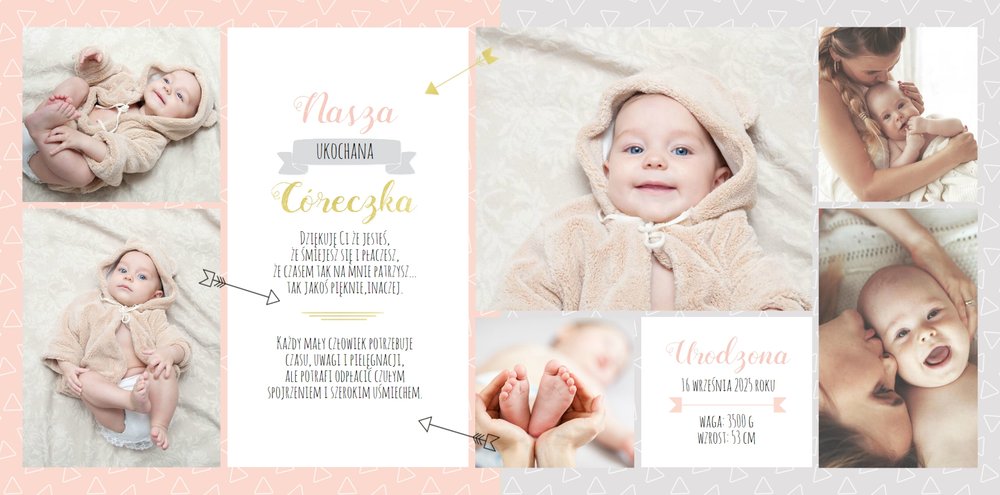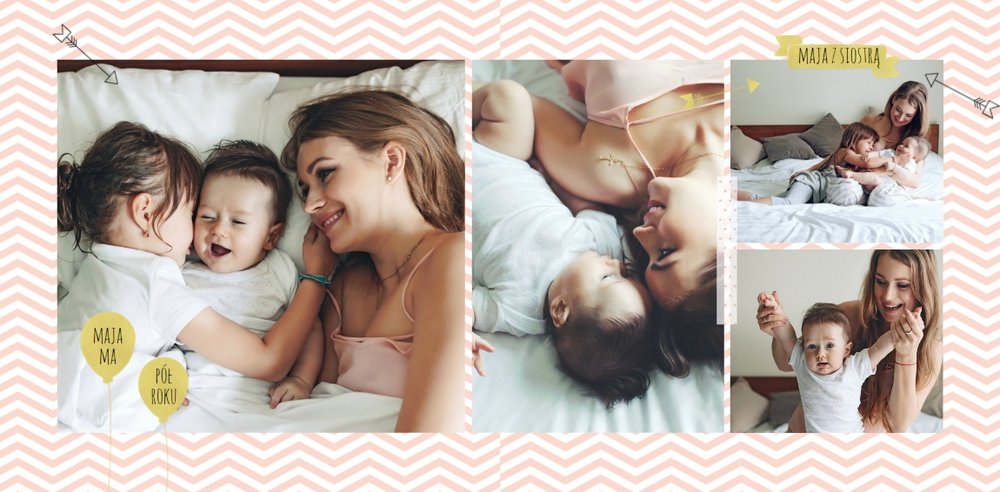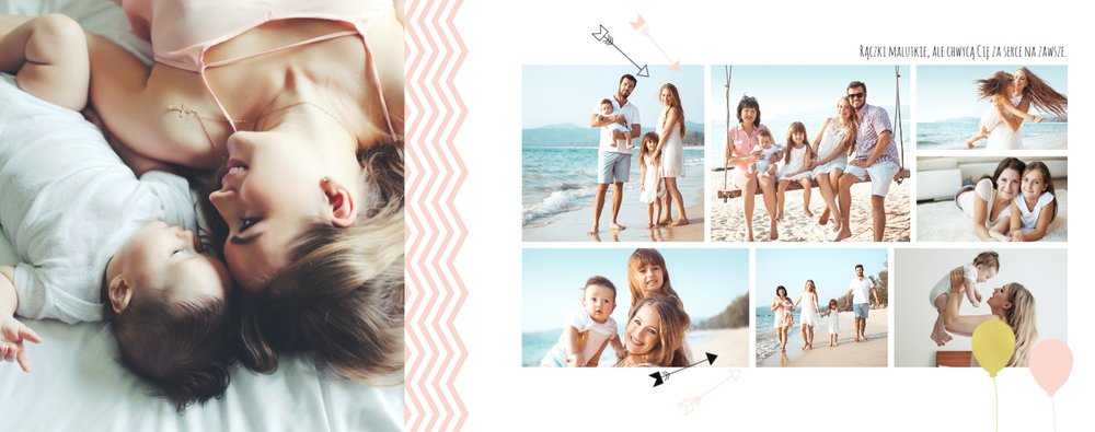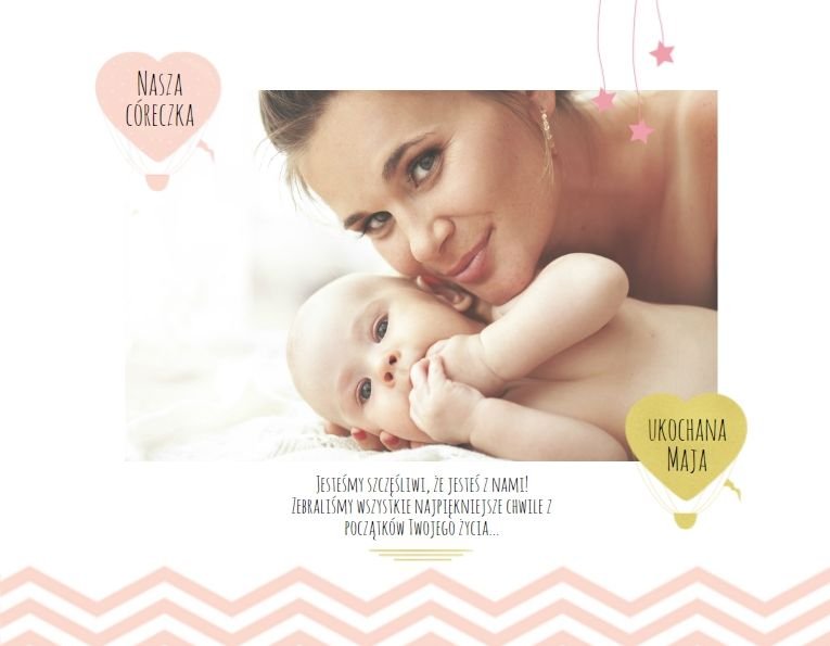 Pierwszy rok córki to szablon dedykowany młodym rodzicom uroczych dziewczynek, którzy pragną uwiecznić pierwsze miesiące z życia córki. Delikatne kolory różu i beżu, mnóstwo miejsca na cudowne zdjęcia, oryginalne układy i dziecięca grafika sprawią, że fotoksiążka z tym szablonem będzie piękną pamiątką na lata.