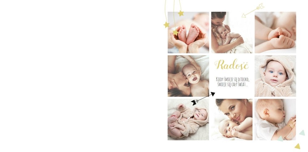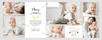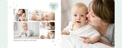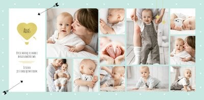 Pierwszy rok syna to szablon dedykowany młodym rodzicom uroczych chłopców, którzy pragną uwiecznić pierwsze miesiące z życia syna. Delikatne kolory mięty i szarości, mnóstwo miejsca na cudowne zdjęcia, oryginalne układy i dziecięca grafika sprawią, że fotoksiążka z tym szablonem będzie piękną pamiątką na lata.