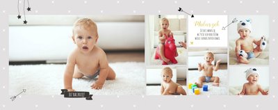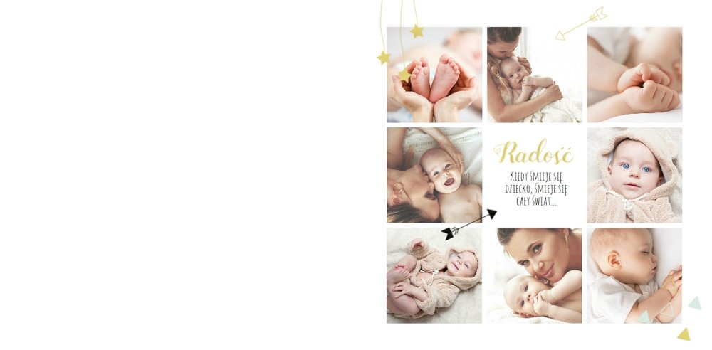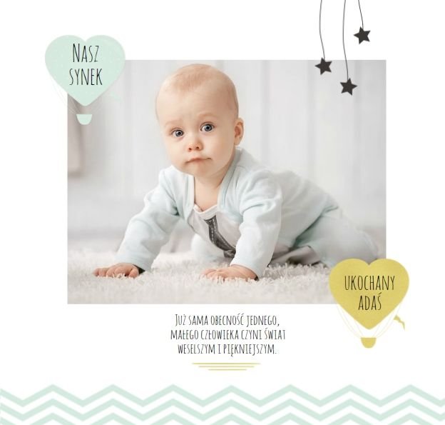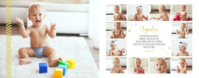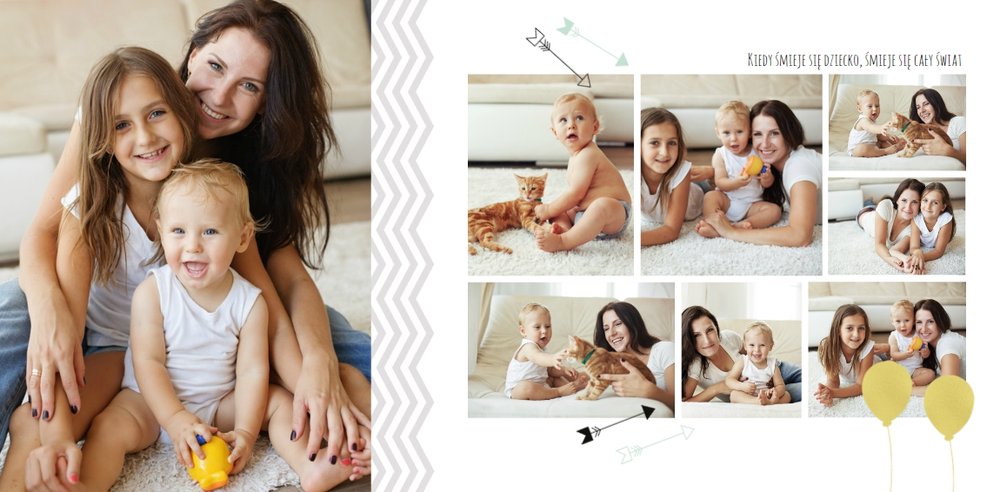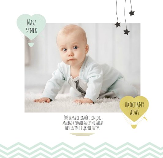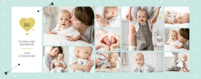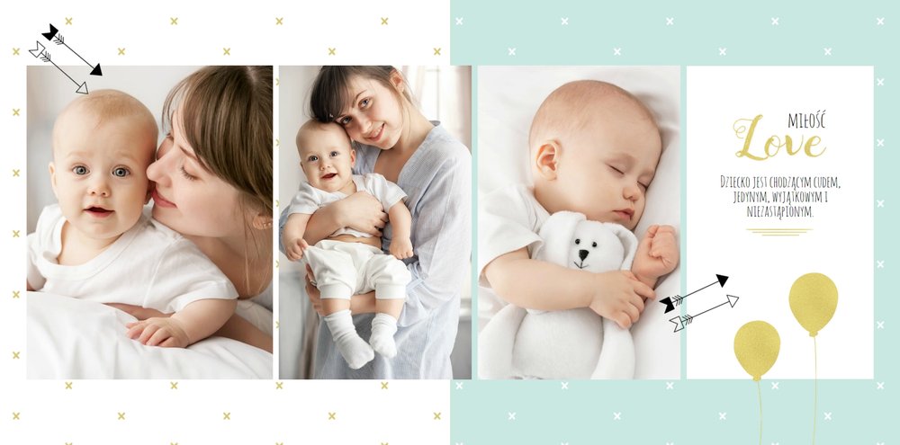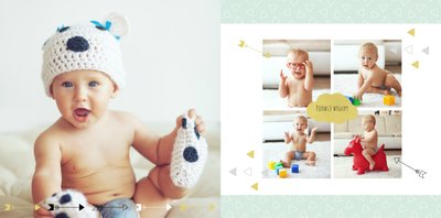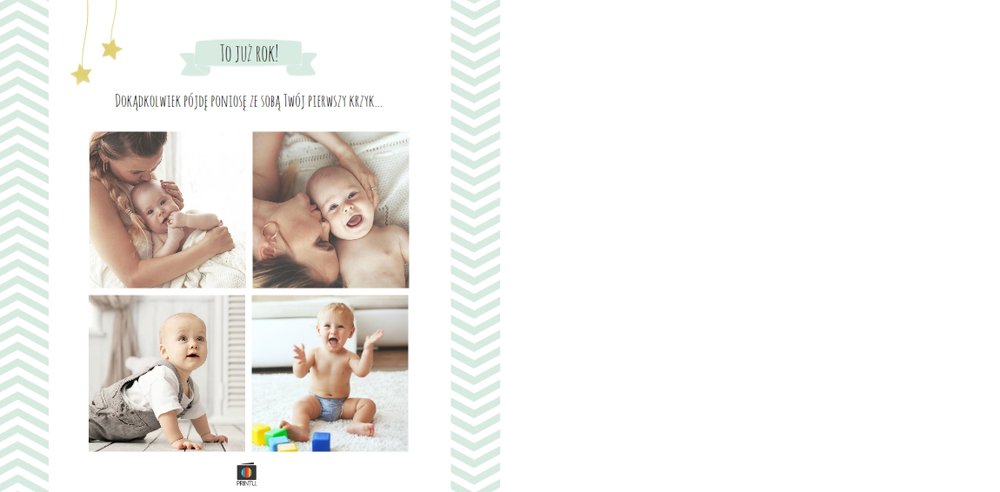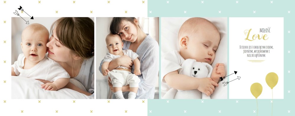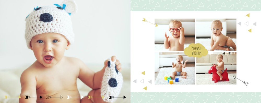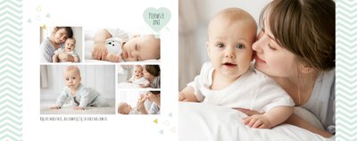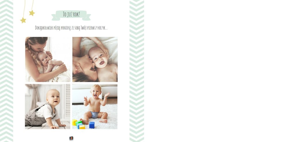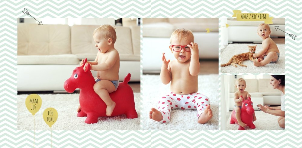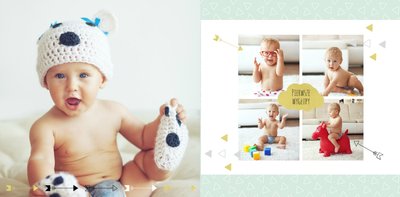Pierwszy rok syna to szablon dedykowany młodym rodzicom uroczych chłopców, którzy pragną uwiecznić pierwsze miesiące z życia syna. Delikatne kolory mięty i szarości, mnóstwo miejsca na cudowne zdjęcia, oryginalne układy i dziecięca grafika sprawią, że fotoksiążka z tym szablonem będzie piękną pamiątką na lata.