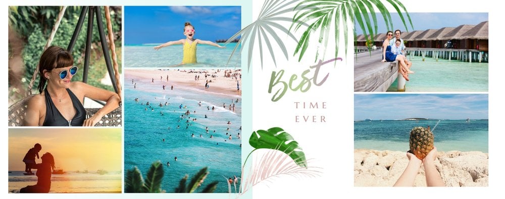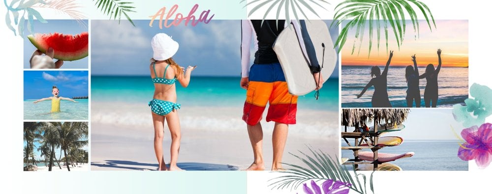 Minimalistyczna forma szablonu pozwala na zachowanie zdjęć z każdej strony świata - ważne aby fotografie pokazywały jak świetnie bawiłeś się na wakacjach życia. Całość dopełniają napisy oraz graficzne elementy symbolizujące lato w pełni.