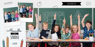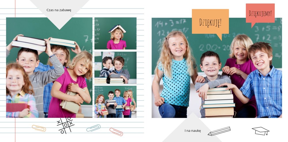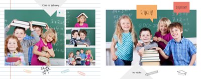 Szablon “Księga pamiątkowa dla Nauczyciela” wyróżnia szkolna typografia z dziecięcymi wierszykami i powiedzeniami, specjalne miejsce na szkolne prace oraz tablica ze zdjęciami kolegów z klasy. Wszystko to zostało ułożone na szarym tle z akcentami kolorów niebieskiego, czerwonego i żółtego. Ozdobne cyfry, litery i strony z zeszytu pozwolą pięknie oprawić zdjęcia ze szkolnej ławki. Fotoksiążka dla Nauczyciela z tym szablonem to świetny wybór!