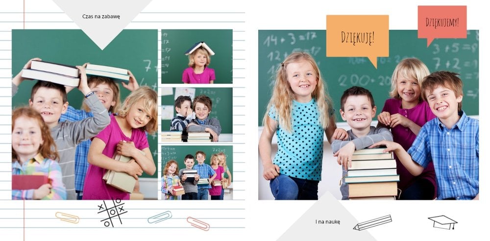 W fotoksiążce z szablonem “Księga pamiątkowa dla Nauczyciela” znajdziesz miejsce nie tylko na zdjęcia, ale również na wierszyki czy dedykację. Łącząc ze sobą wszystkie elementy, w efekcie końcowym powstanie oryginalny album pamiątkowy, który na pewno zrobi ogromne wrażenie na Nauczycielu.