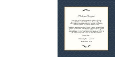 Fotoksiążka na podziękowanie dla rodziców to najlepszy prezent, jaki Wasi rodzice mogą sobie wymarzyć. Produkt ten skrywa rodzinne wspomnienia, najważniejsze momenty, wyjątkowe daty i pełne wdzięczności słowa, zamknięte w stylowej oprawie. W wyrażeniu tych wspaniałych emocji z całą pewnością pomoże Ci gotowy szablon fotoksiążki “Podziękowania dla rodziców”, który utrzymany jest w eleganckiej stylistyce. Wewnątrz szablonu dominują kolory złota, beżu, granatu, a zdjęcia wyeksponowane są w ozdobnych ramkach lub na stronach z ornamentami. Wysoka jakość wydruku oraz oryginalna oprawa nadają całości estetycznego charakteru.