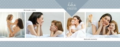 Dzień Matki to szczególne święto w roku, dlatego warto przygotować wyjątkowy prezent dla mamy. Fotoksiążka ze wspólnymi zdjęciami to dobry pomysł na prezent na Dzień Matki. Z szablonem Prezent dla mamy, stworzenie fotoksiążki zajmie parę chwil. Układ graficzny jest klasyczny, utrzymany w stonowanej kolorystyce błekitu i beżu, można też zamieścić w projekcie życzenia dla Mamy.