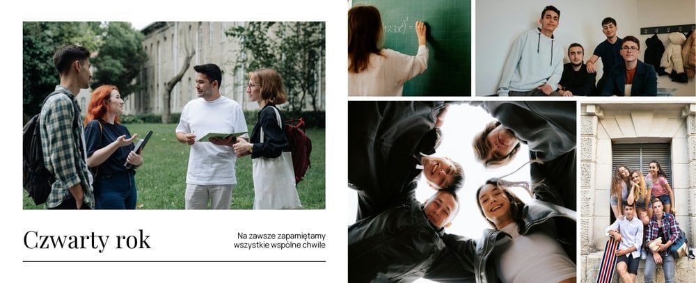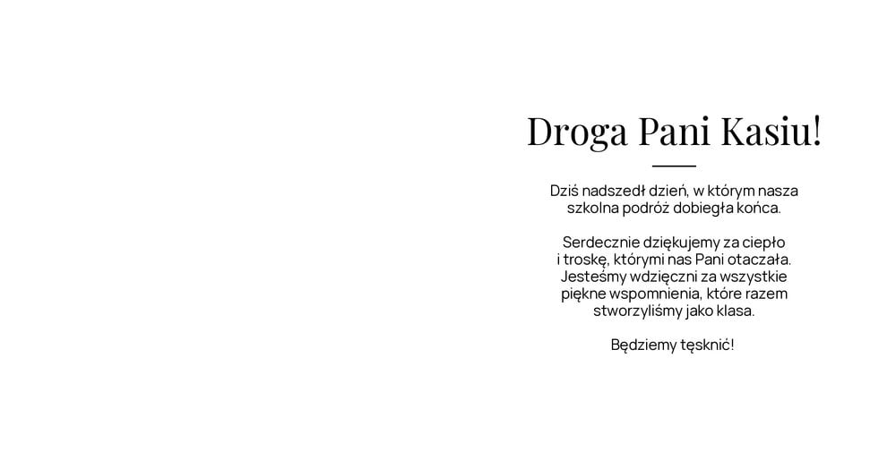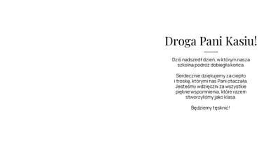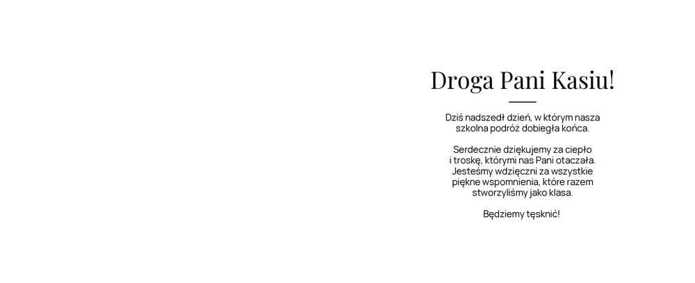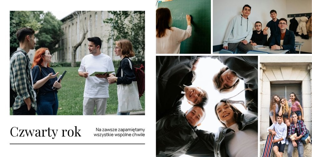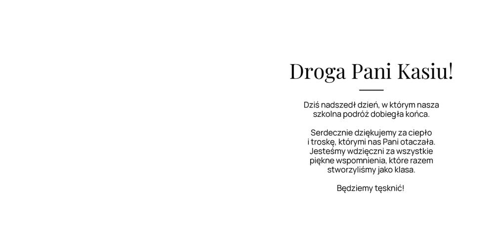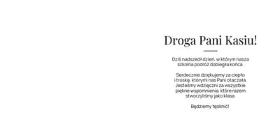 Szablon fotoksiążki "Prezent dla nauczyciela na zakończenie roku" łączy elegancki i minimalistyczny design z prostotą tworzenia. Wystarczy, że zbierzesz najważniejsze zdjęcia z wszystkich lat nauki i umieścisz je w komórkach zdjęciowych. Zdjęcia ze studniówki, wigilii klasowej, wycieczek szkolnych czy codziennych zajęć - układy zdjęciowe na każdej stronie zostały skomponowane tak, aby jak najlepiej wyeksponować każdą klasową fotografię. Użyj uniwersalnych życzeń i tekstów jako podziękowania dla wychowawcy, lub uzupełnij je tak jak wolisz. Możesz również skopiować projekt fotoksiążki i obdarować nią siebie oraz swoich przyjaciół z klasy, jako bezcenna pamiątka ze wspólnych, szkolnych lat.
