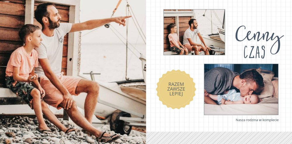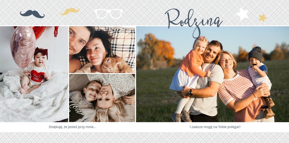 Piękne, rodzinne chwile warto celebrować i utrwalać w pamięci. Fotoksiążka pełna zdjęć bliskiej rodziny będzie najpiękniejszym prezentem dla każdego Taty. Szablon Prezent dla taty dedykujemy wszystkim, którzy chcą podarować swojemu Tacie coś wyjątkowego. Szare delikatne tła idealnie skomponują się z rodzinnymi fotografiami lub skanami zdjęć. Fotoksiążka zaprojektowana z tym szablonem będzie idealnym prezentem na Dzień Ojca oraz wiele innych ważnych okazji.