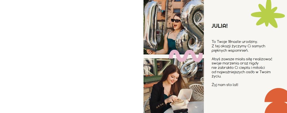 Szukasz prezentu na 18 urodziny Twojej przyjaciółki lub Twojego przyjaciela? Fotoksiążka to idealny pomysł, aby zachować wszystkie ich najcenniejsze wspomnienia w jednym miejscu. Z szablonem “Prezent na 18 urodziny” w szybki i prosty sposób stworzysz oryginalną pamiątkę na lata. Połączenie czerni i nasyconych kolorów idealnie podkreśli każdy rodzaj zdjęcia - z wyjazdów, koncertów, wspólnych imprez czy po prostu codziennych chwil. Abstrakcyjne kształty i maski również dodadzą im uroku.