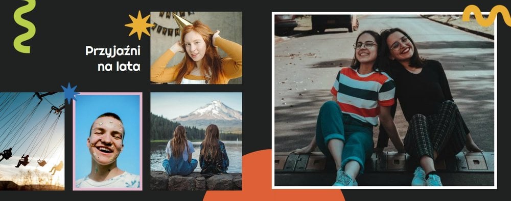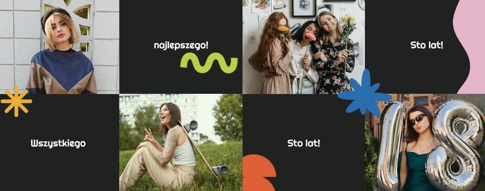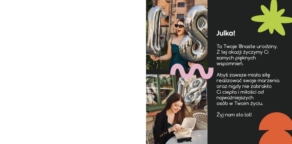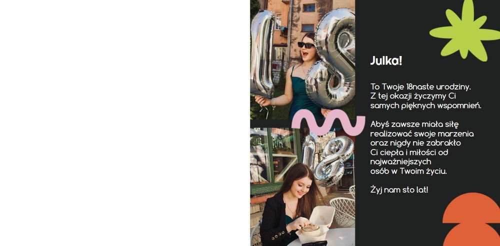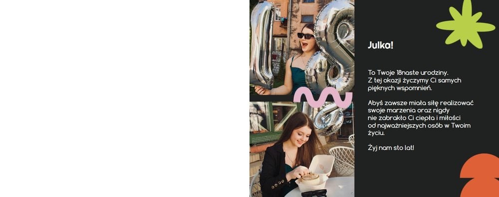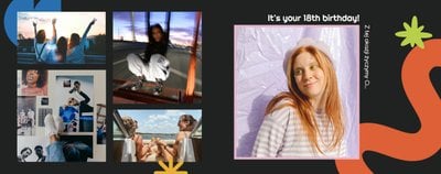 Szukasz prezentu na 18 urodziny Twojej przyjaciółki lub Twojego przyjaciela? Fotoksiążka to idealny pomysł, aby zachować wszystkie ich najcenniejsze wspomnienia w jednym miejscu. Z szablonem “Prezent na 18 urodziny” w szybki i prosty sposób stworzysz oryginalną pamiątkę na lata. Połączenie czerni i nasyconych kolorów idealnie podkreśli każdy rodzaj zdjęcia - z wyjazdów, koncertów, wspólnych imprez czy po prostu codziennych chwil. Abstrakcyjne kształty i maski również dodadzą im uroku.