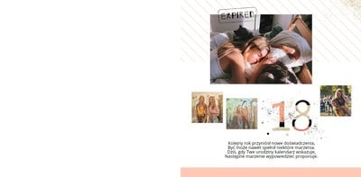 Idealnym szablonem do stworzenia albumu na 18 urodziny jest ten o nazwie „Prezent na 18”. Minimalistyczna, a zarazem zachowana w przyciągających uwagę kolorach kompozycja fotoksiążki na 18 przypadnie do gustu każdemu – niezależnie od płci. Charakter fotoksiążki na 18 urodziny dodatkowo podkreślają urodzinowe elementy graficzne i luźne sentencje.