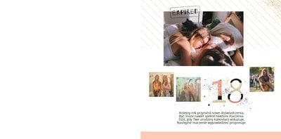Idealnym szablonem do stworzenia albumu na 18 urodziny jest ten o nazwie „Prezent na 18”. Minimalistyczna, a zarazem zachowana w przyciągających uwagę kolorach kompozycja fotoksiążki na 18 przypadnie do gustu każdemu – niezależnie od płci. Charakter fotoksiążki na 18 urodziny dodatkowo podkreślają urodzinowe elementy graficzne i luźne sentencje.